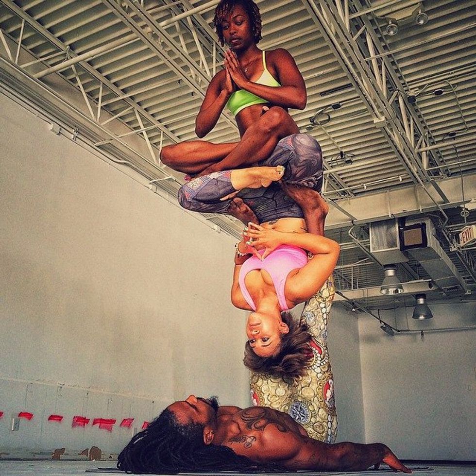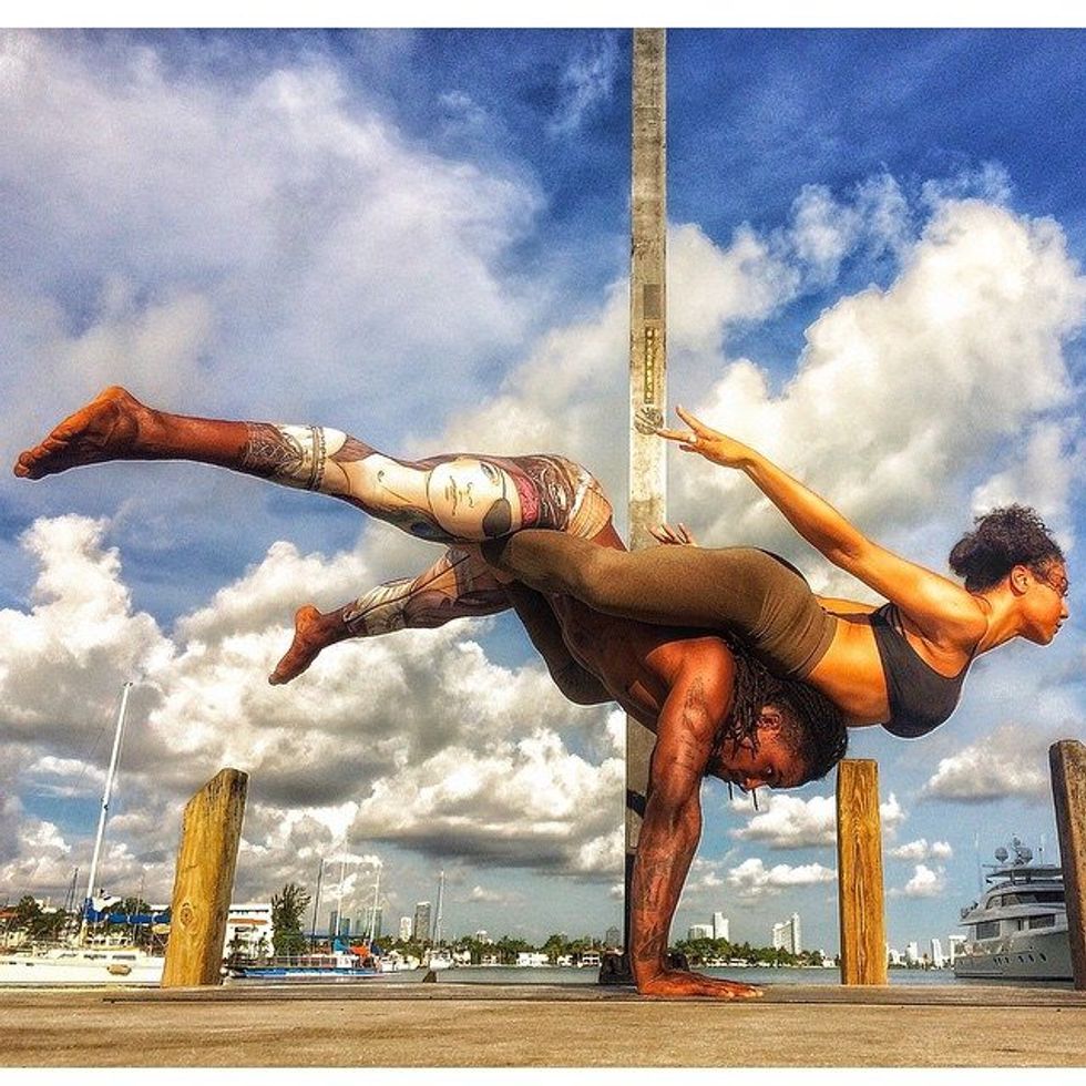 I still work out, but yoga pretty much gets me in shape for acro because it's kind of hard to do if you have tight hamstrings and tight hip flexors, so yoga pretty much gets you ready for the acro because it's hell to try to do a yoga pose with somebody on top of you or in the other person's case doing it on top of somebody's feet.