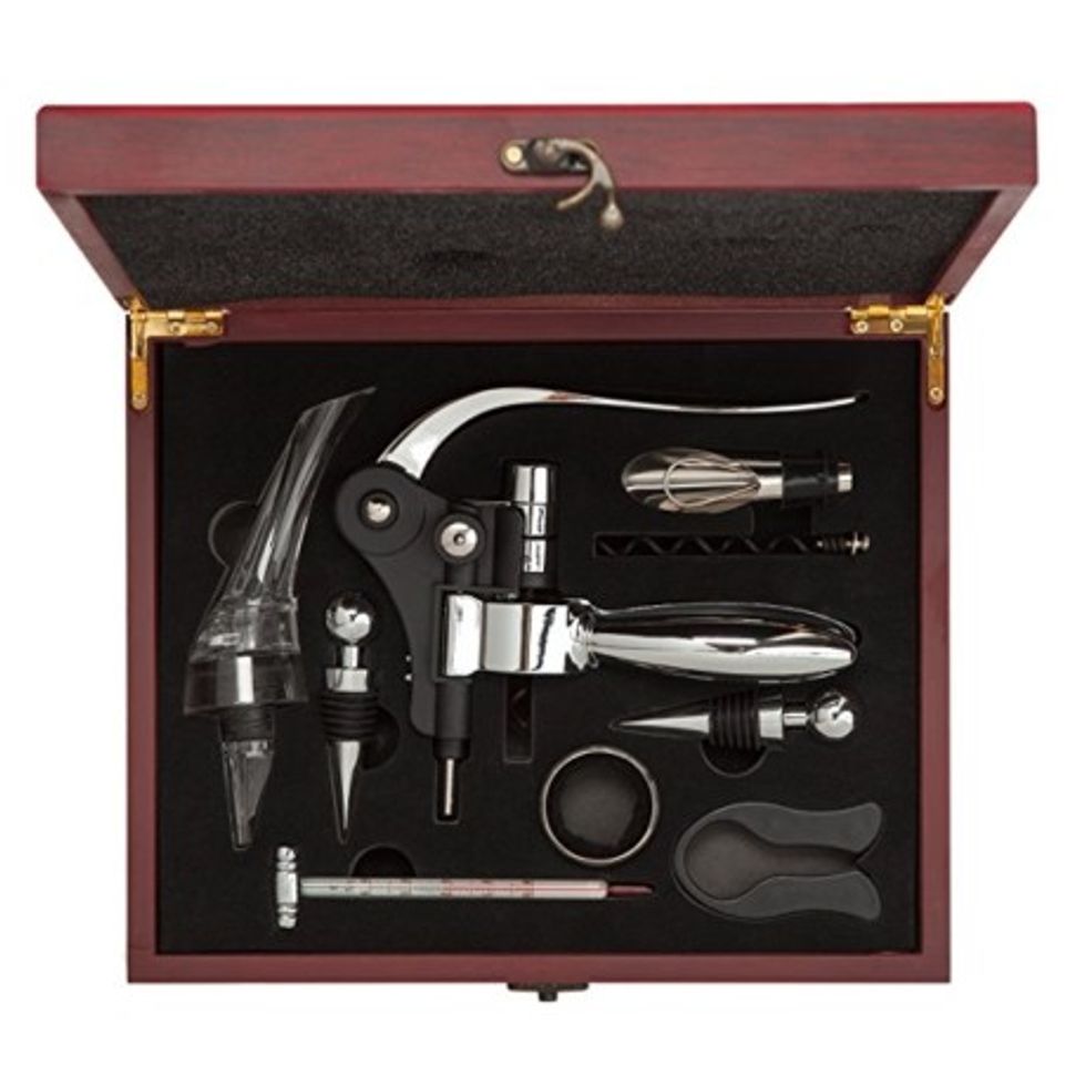 Everything that the wine enthusiast in your life may ever need to enjoy a glass of wine is all right in this kit. It comes equipped with a high-quality lever wine corkscrew, wine aerator, foil cutter, wine pourer, wine collar (drip ring), thermometer, replacement screw and two bottle stoppers.