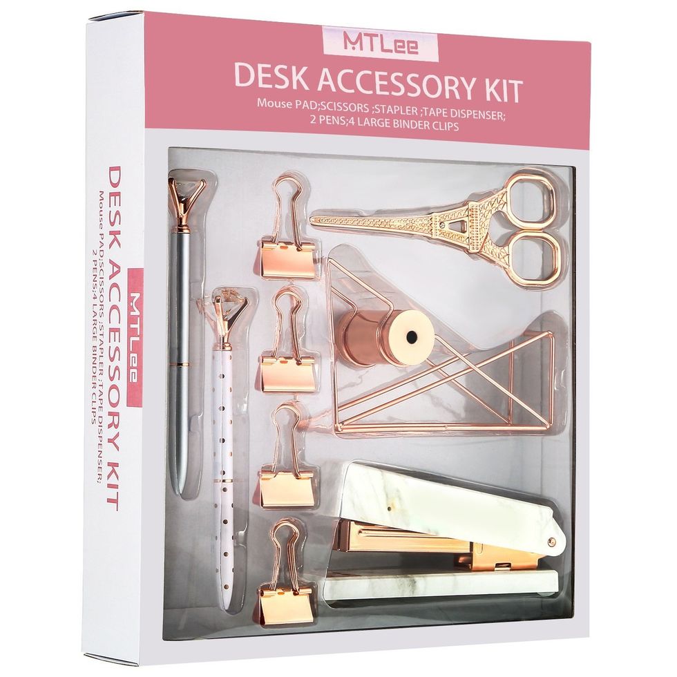 Much like people, when work spaces look good they feel good. This rose gold desk accessory kit is a great addition to any work space. (Shop Here.)