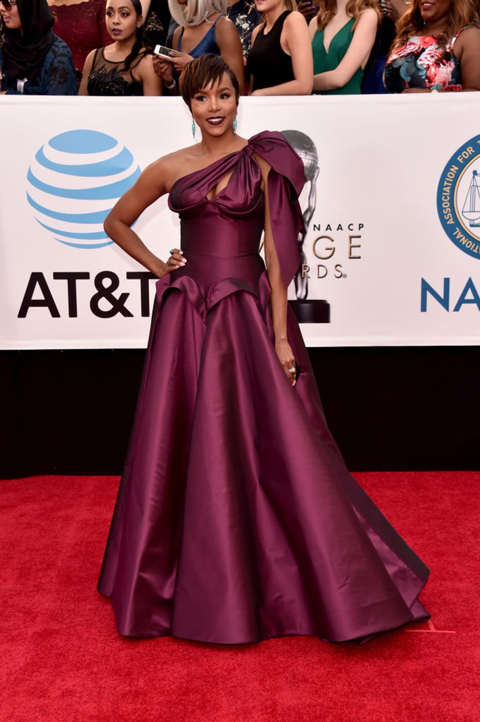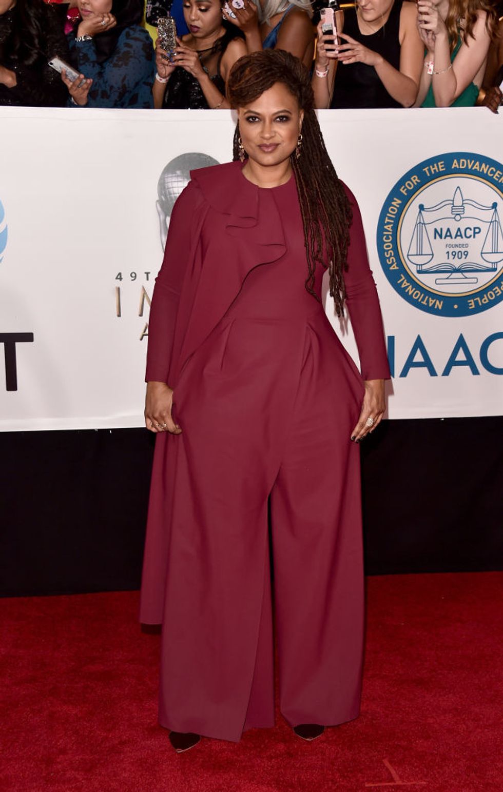 Ava DuVernay donned a Greta Constantine custom burgundy pantsuit that perfectly complemented the red on the Image Awards red carpet. She radiates confidence and intelligence and is the epitome of a Queen, Sugar.