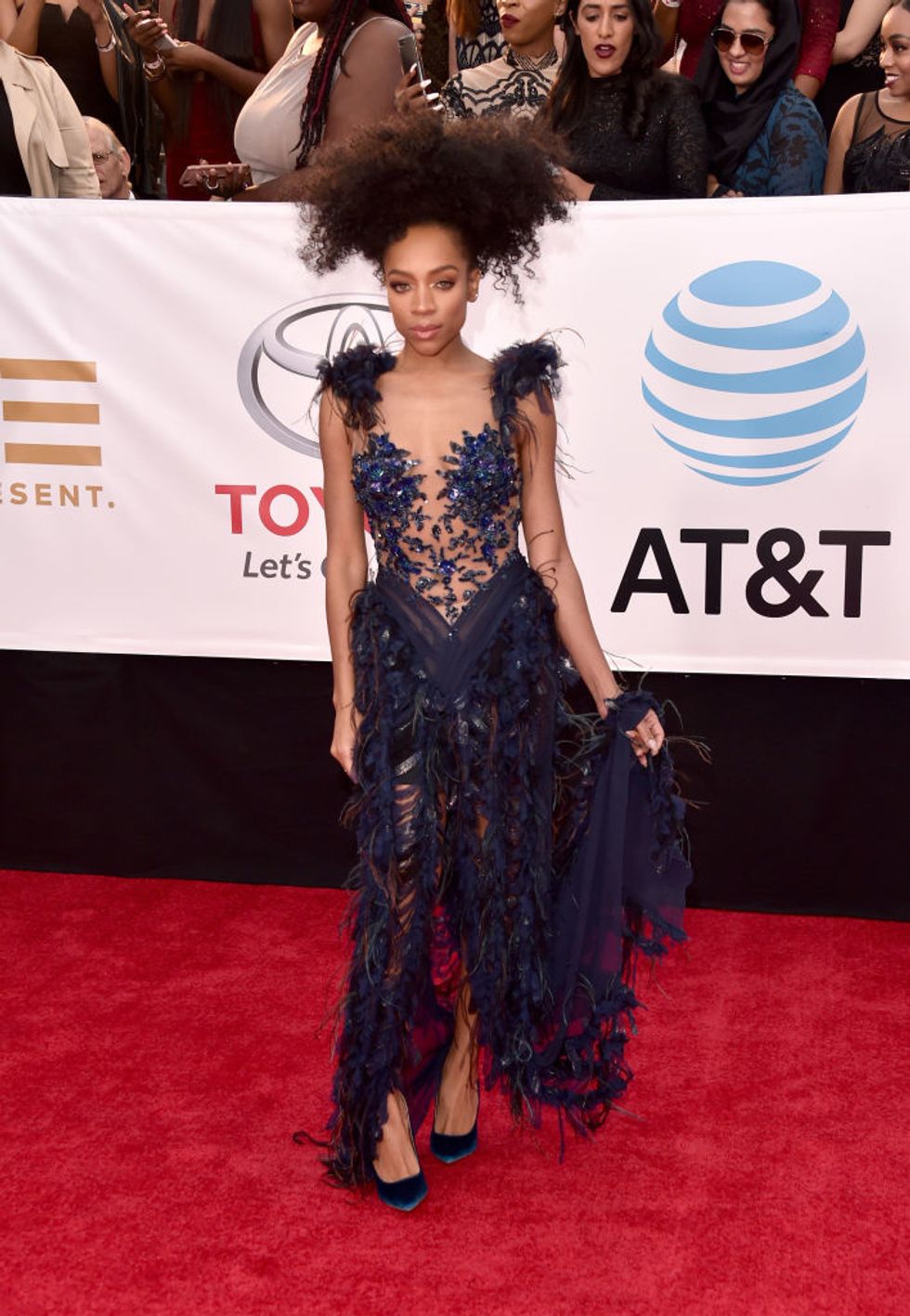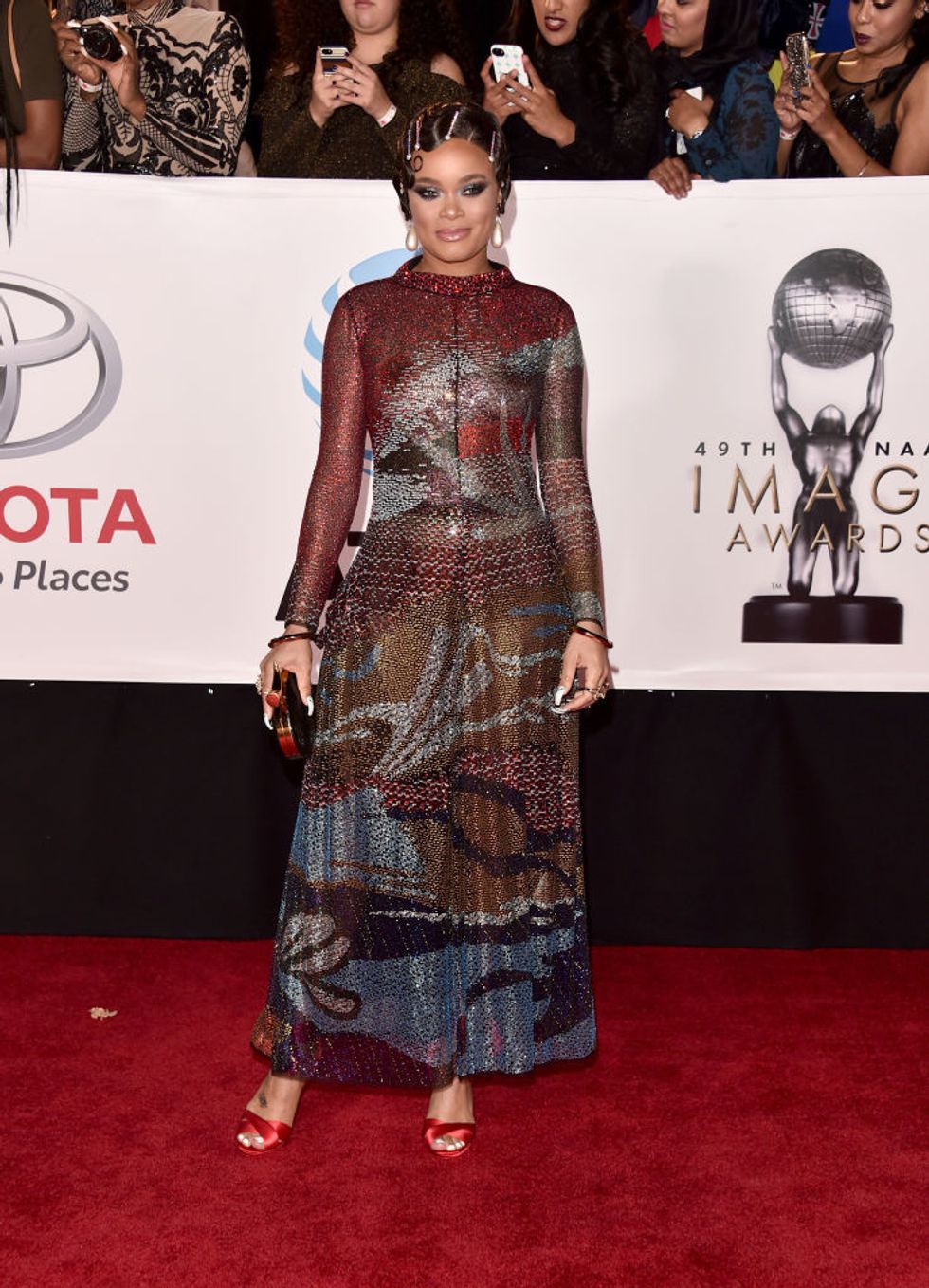 Singer Andra Day embodied her eccentric eclectic style and was an absolute vision in a Giorgio Armani FW17 dress. She accessorized with red satin sandals by Louboutin, a Giuseppe clutch, and hair pins on deck.