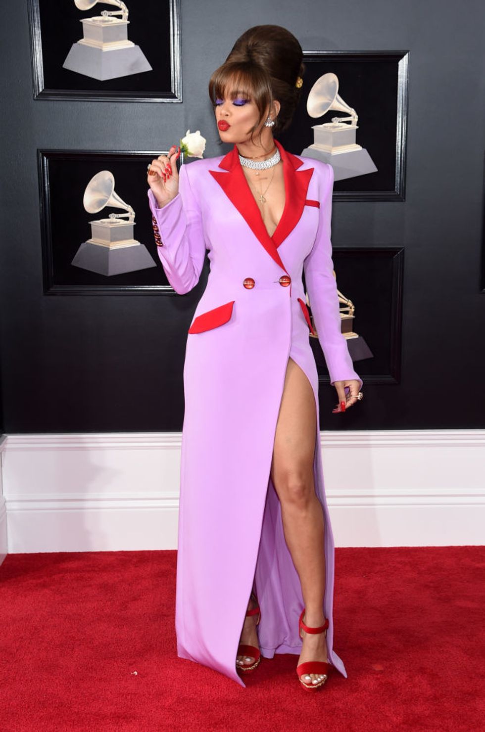Andra Day stayed true to her unique style with a Victoria Hayes tuxedo dress. The luminous colors were inextricable with her pinup hairstyle and stiletto nails.