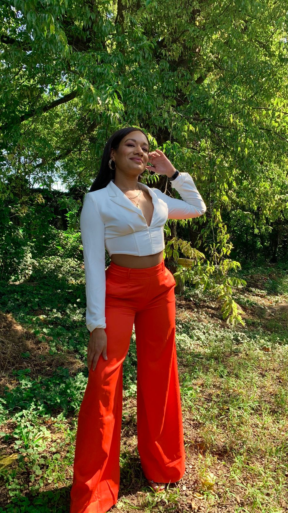 While everybody loves a good monochromatic moment, the most dynamic and stylish looks are mixed and matched. A cropped blazer is one of my favorite items in my wardrobe right now. The neckline is seductive yet not too revealing, while the structured shoulder adds a hint of professionalism. The high-waisted pants elongate the legs, while the exaggerated bell-bottom is very on-trend for fall/winter. Step out of your comfort zone and play with statement colors that elevate your look.