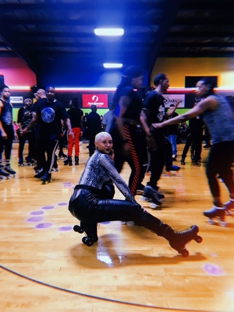 I'm considered a JB skater, which is a Chicago-style of skating. The term originates from the Godfather of Soul James Brown. Growing up, I roller-skated to James Brown music, JB tracks (also known as skate remixes), hip-hop, rock & roll, funk, house and R&B. Throughout college, I started traveling for roller-skating events which is the highlight of my skate-life. I get to wear dope outfits with my friends, thrive off of the crowd's energy, and skate all night until my legs are sore. Even though I've done so many great things with roller-skating, like class projects, performances, and videos, there is still nothing like going back home to Chicago and skating to a combination of old-school and new school music.