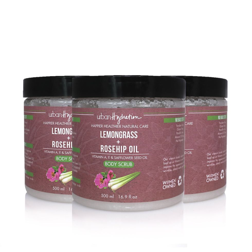 Urban Hydrations Lemongrass and Rosehip Oil Body Scrub helps promote circulation, moisture retention, and cellular regeneration. This scrub is free of parabens and paraffin and contains natural ingredients like Vitamin A, Vitamin E, Rosehip, and Lemongrass Oil. The active ingredients — Lemongrass and Rosehip — help prevent harmful substances, oil, and dirt from the skin, which keeps your skin free of impurities.