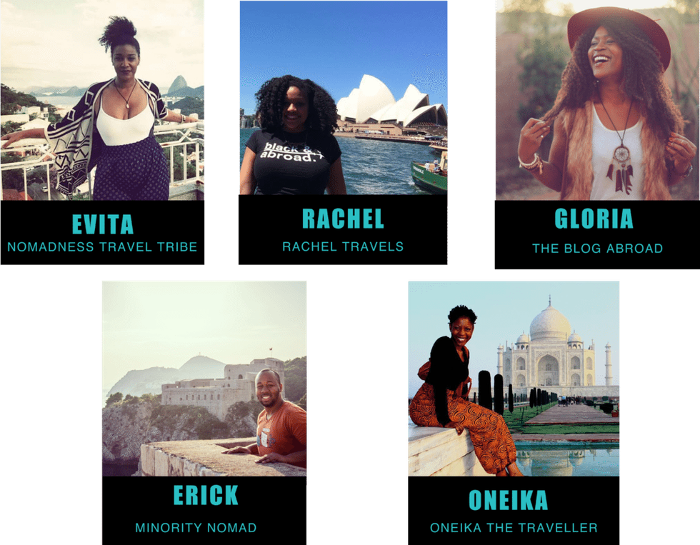 Follow our travel bloggers: Evita (The Nomadness Tribe), Gloria (The Blog Abroad), Erick (Minority Nomad), Rachel (Rachel Travels), Oneika (Oneika the Traveller).