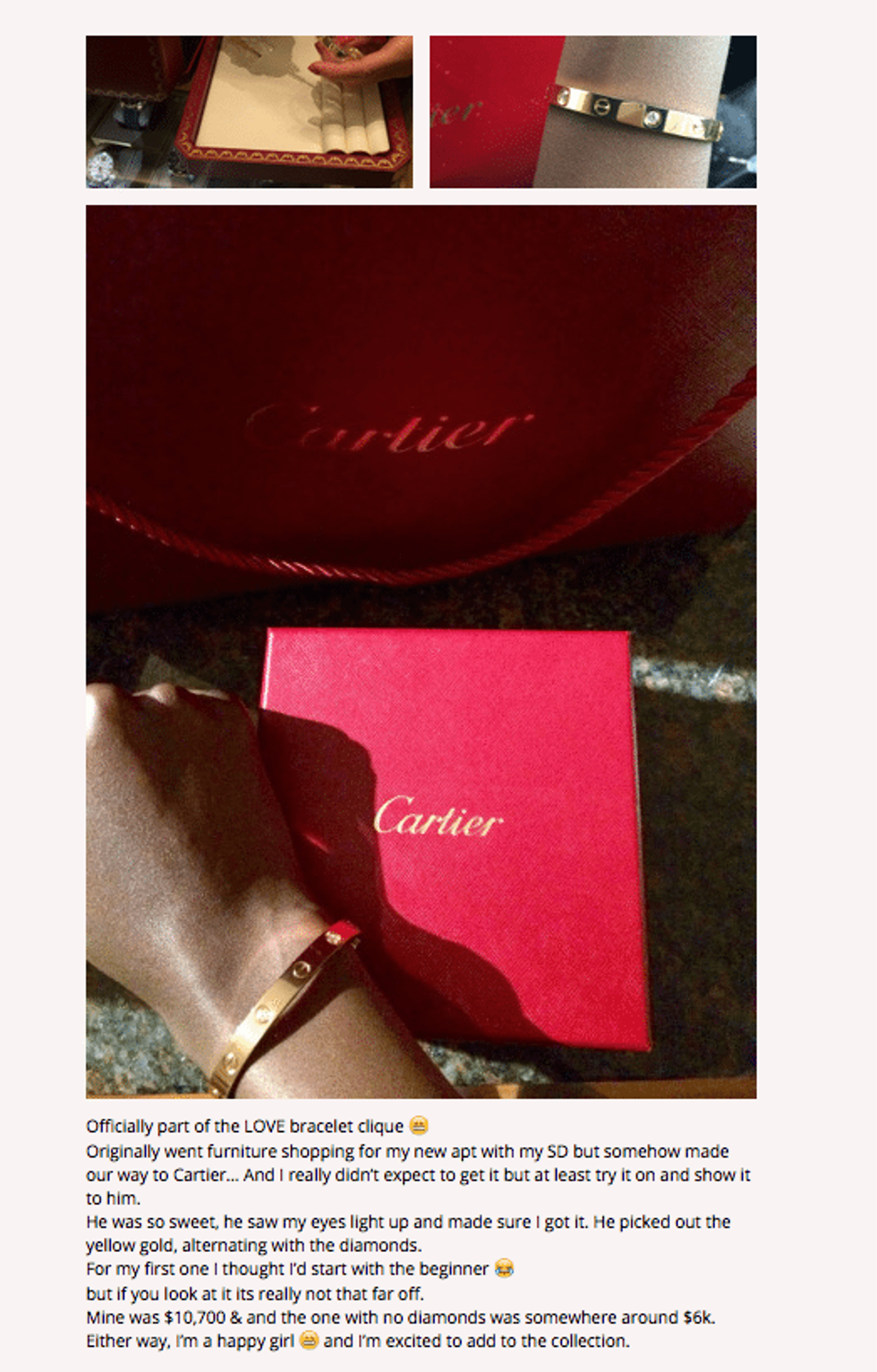 But a real sugar baby will show off what she has as a way to “market” the lifestyle, and a lot of times what she is showing you is 100% paid for (at least with the sugar babies that I’ve met). You’ll never see her face, and she’ll never mention her sugar daddy’s name. Those are the rules.