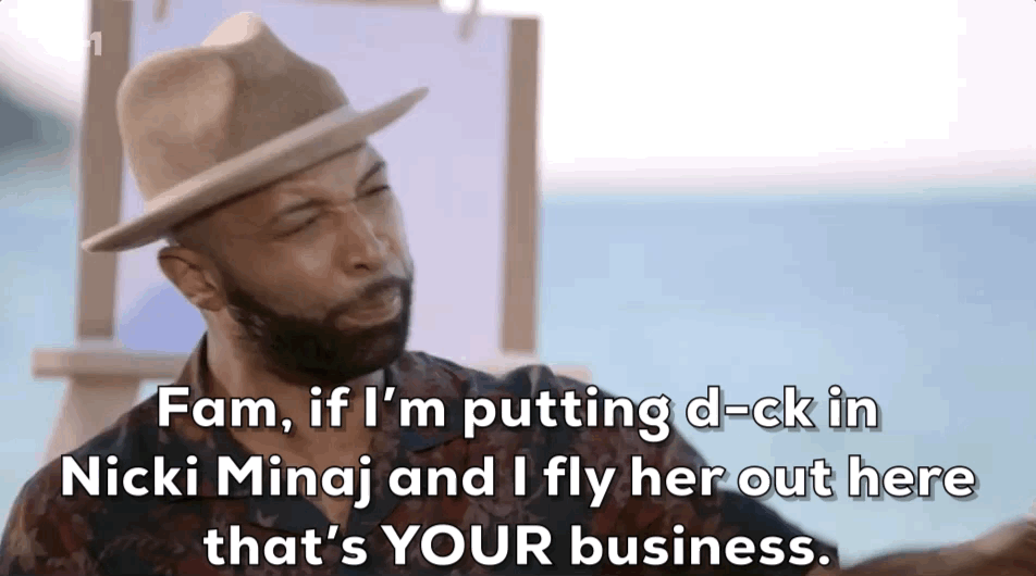 Which, although I'd never blindside my bestie, is true. Why would a grown man need permission from anyone to bring his girl on a vacation, even if it is just for some much-needed drama and publicity for his reality TV show? The breakdown in Joe and Safaree's apparently fragile friendship still didn't have my complete attention until Joe said this: