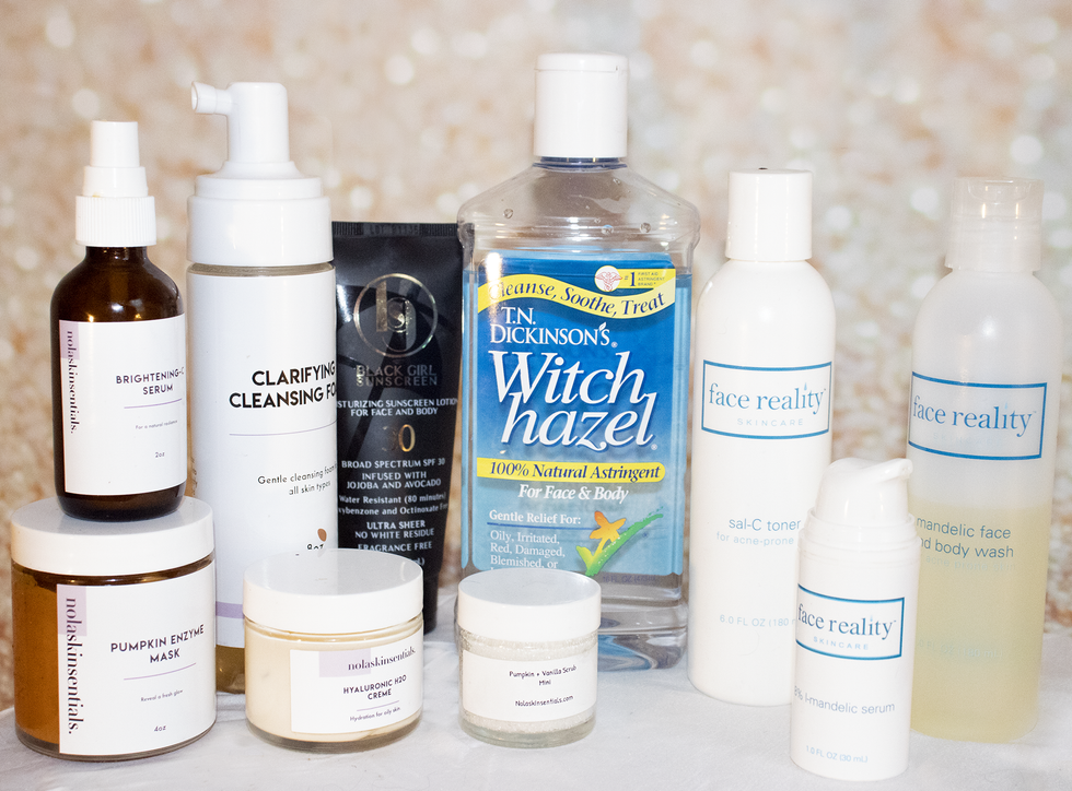 "For my cleanser, I use Face Reality Mandelic Face and Body Wash, or Nolaskinsential Clarifying Cleansing Foam if I'm feeling extra dry, and rinse with cold water. I tone using Face Reality Sal-C Toner, which also works as a great exfoliant, and Thayers Witch Hazel. I hydrate and moisturize using Nolaskinsentials Hyaluronic H2O Creme, which seems to be getting my hyperpigmentation all the way together. For my serums, I'm currently using Face Reality Mandelic Serum and Nolaskinsentials Brightening C Serum. Last but certainly not least, I add a layer of Black Girl Sunscreen for the ultimate UV protection. While some skin experts say it's best to stick to one skincare system, I've found that my skin responds best to a special mix of products from two or three brands."