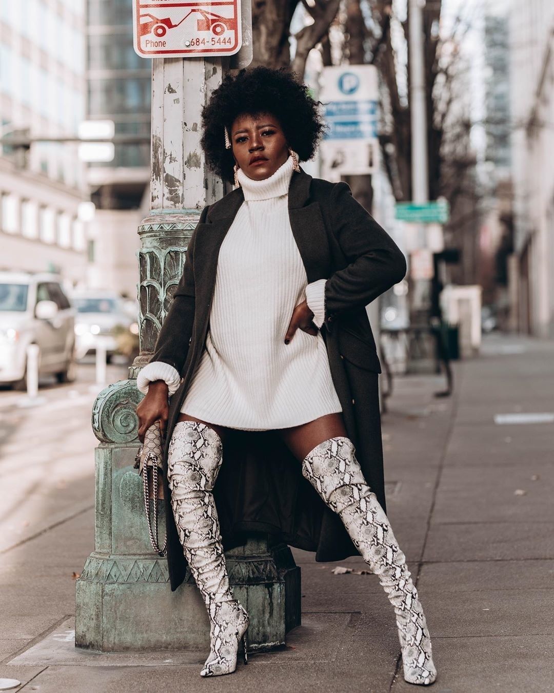 As for me and my wardrobe, I must have a pair of snakeskin boots. Snakeskin boots have been deemed the pièce de résistance of this trend fluctuation. They are ultra-modish and provide an elevated aesthetic because of the print and texture. I decided to bring the heat to the winter in my romper but you can also rock these boots with a chunky sweater and skinny jeans.