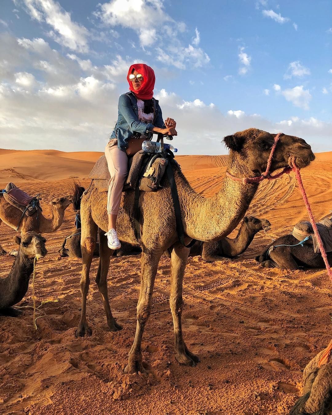 Whether traveling with a group or on my own itinerary, I like to do unique things to further the experience. For this particular trip, I decided to go glamping in the desert with my friends. This activity fell right in the middle of our trip and was perfectly timed because it was a planned stop on our way from Marrakech to Fez. I wasn't sure what to expect when we pulled up to our stop in Merzouga. We were greeted by the camping site staff, and after they loaded our bags into cars, they escorted us to our transportation to the campsite: Camels.