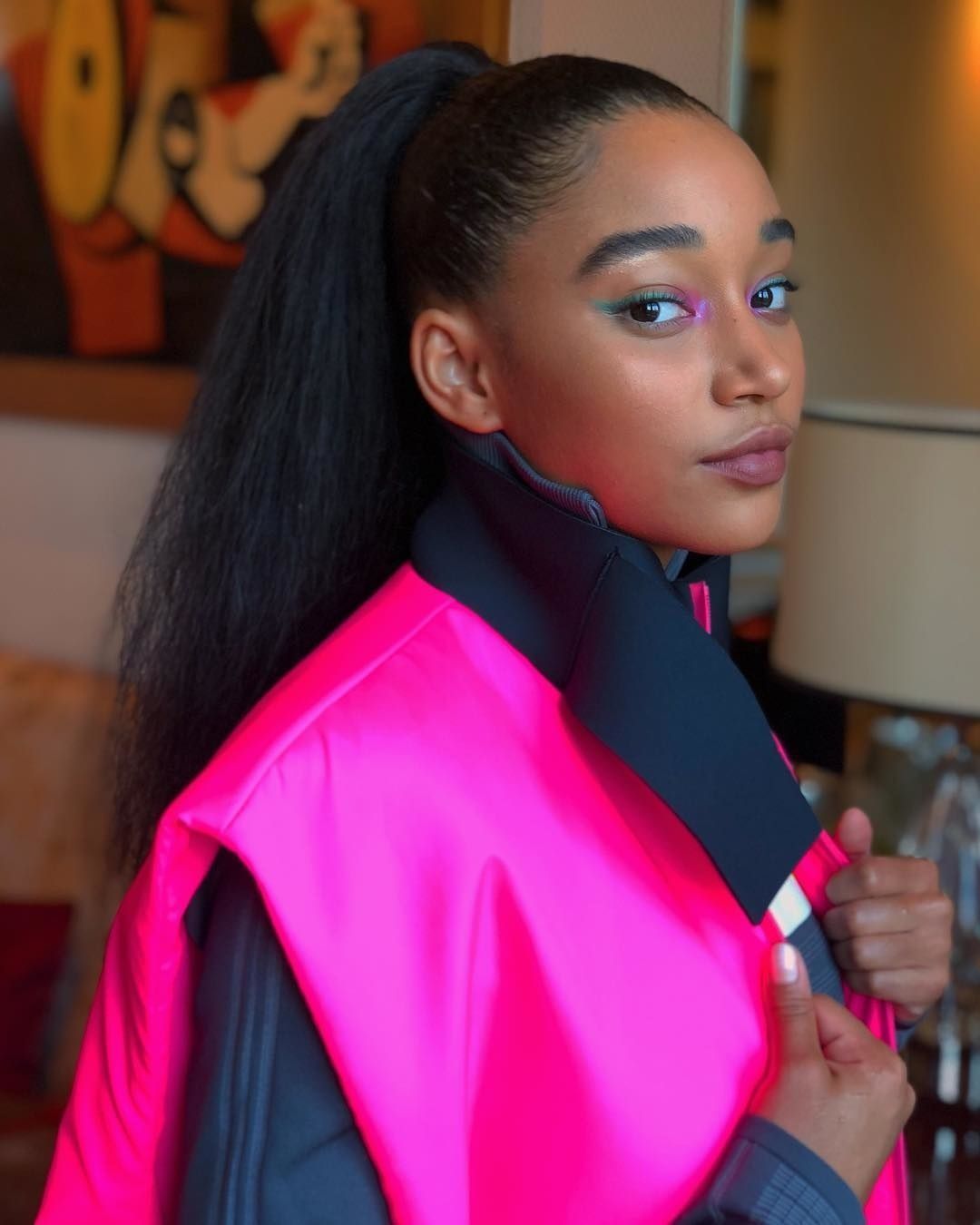 Amandla Stenberg shows that we can have a two-tone vibe, like this teal cateye and a magenta color in the inner corner.