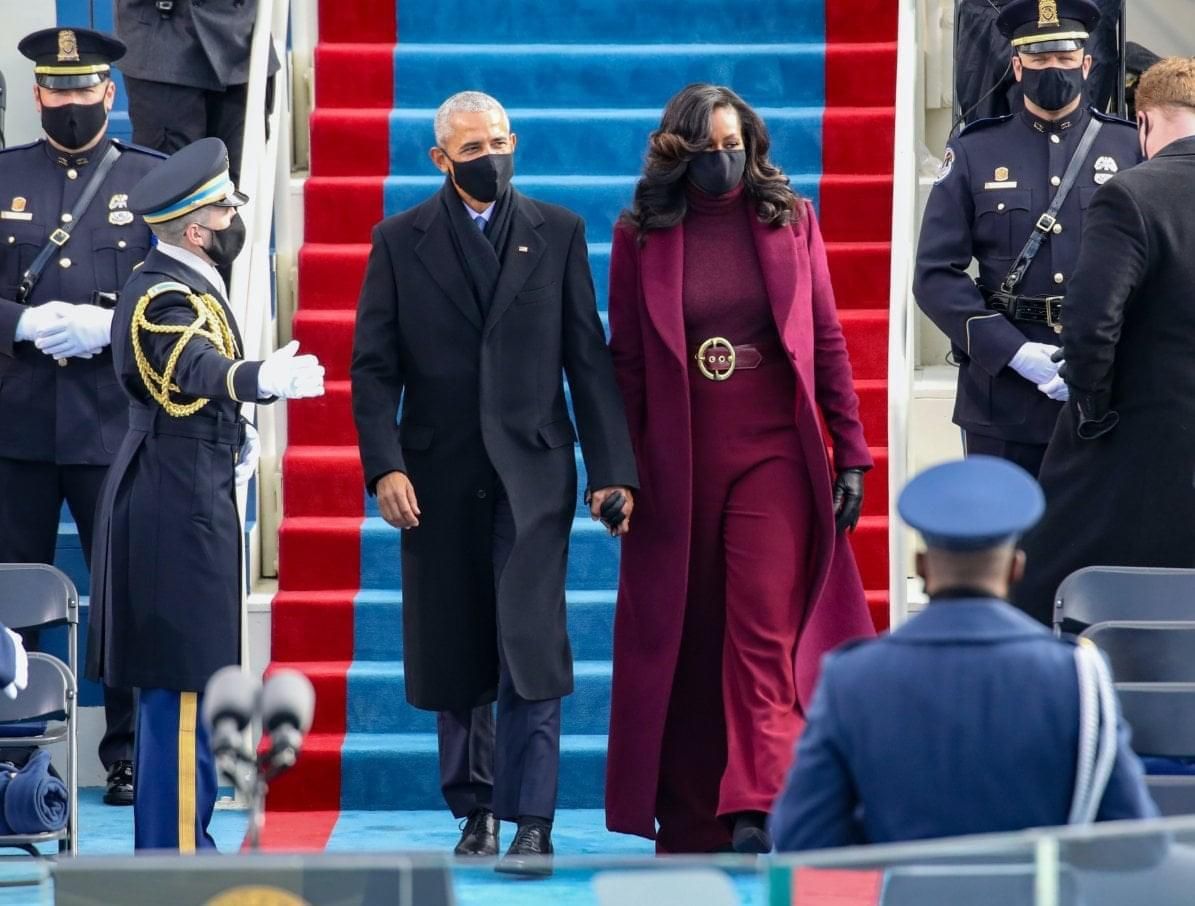 Each are making waves as he dressed both Kamala Harris and Michelle Obama for Joe Biden's Presidential Inauguration. The former First Lady opted to wear a light plum suit by Sergio Hudson, which featured high-waist, wide-leg pants, a cozy turtleneck, and a floor-length coat, all tied together with a statement-making gold-hardware belt. She killlllled the look, sending the world wide web into a freenzy, accessorizing with black suede Stuart Weitzman boots, a black Christy Rilling face mask (which was simple, but set the 'fit out), and black leather gloves.