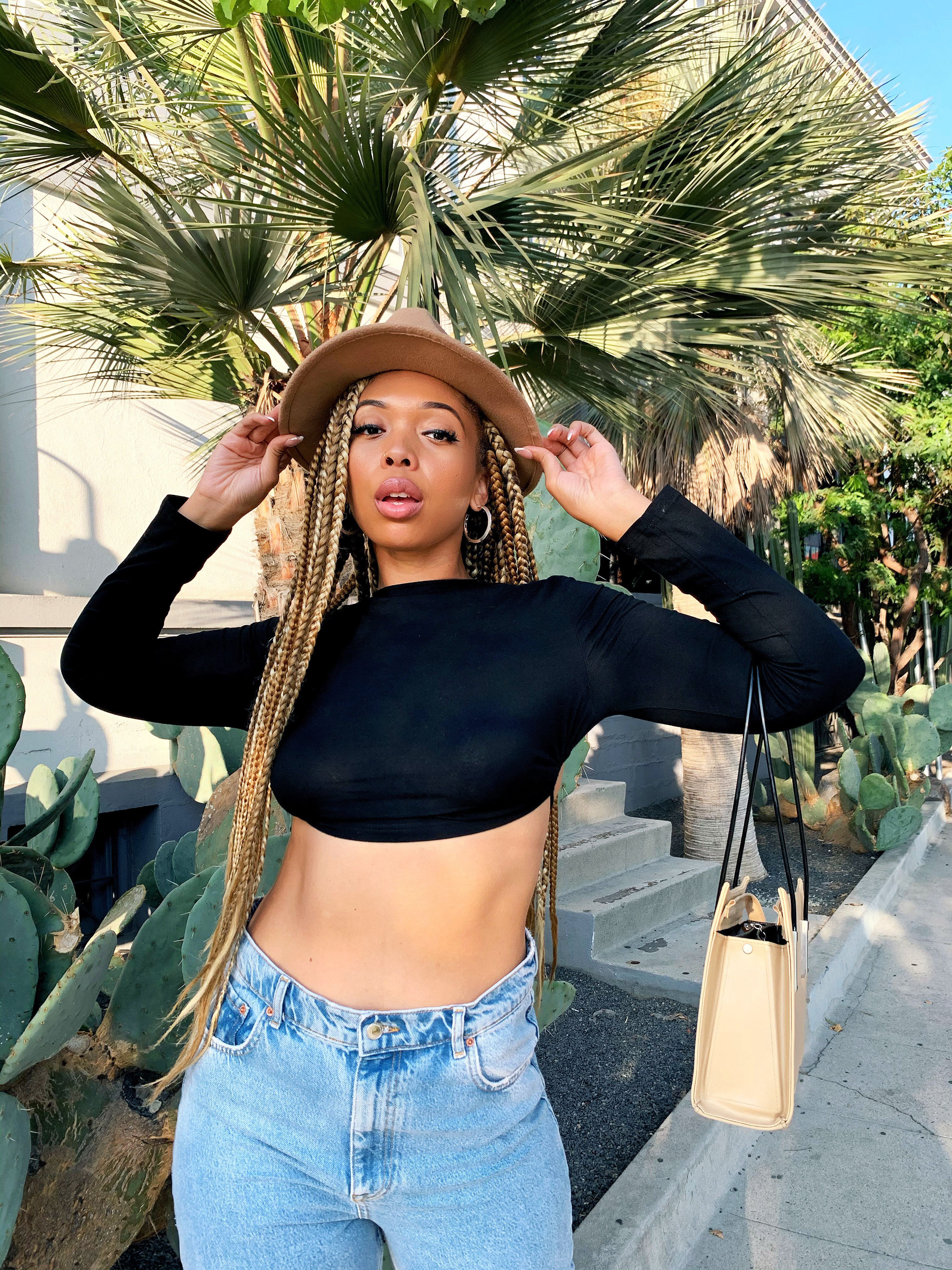 Growing up a Cali girl, I hardly ever experience extremely cold temperatures during fall as to why it's easy to incorporate cropped tops into my outfits this time of year. This BASIXX long sleeve crop is a super comfortable and lightweight crew neck with an exposed back for a bold-yet-fun transitional outfit, making it one of my seasonal favorites. Paired with a wide brim hat and snake print boots, I couldn't complete this outfit without my 90s flared jeans to elevate this western-inspired look.