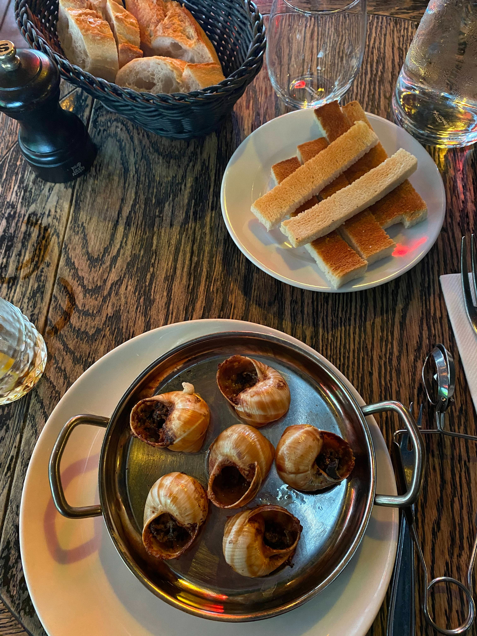 I was ready to go for snails for a second time. But this time, I didn't choose to have some in any random place, I went to L'escargot Montorgueil. On the menu, you have the choice between big or small snails, which can be cooked with foie gras, truffle, or even pepper. They also serve classic French dishes like duck, beef, pork, lamb, and salmon, and they, of course, serve frogs.