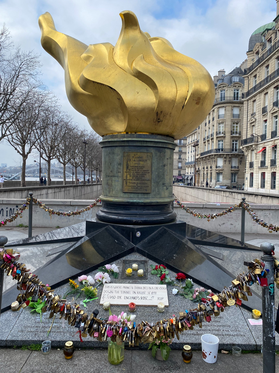 Within minutes, you'll arrive at the Alma Bridge. Facing the bridge, you will see the Flame of Liberty, a statue gifted from the U.S. to France during the '80s. You can see in its design that it is made to emulate the flame of the Statue of Liberty as a symbol of the great relationship between the two countries. However, many Parisians think of this installation as a gesture from the Americans to France. Rather, they see this statue as a monument built to honor the late Princess Diana, who passed away in a tragic accident that happened nearby. People often leave a flower at the feet of this Flame to commemorate the Princess of Hearts.