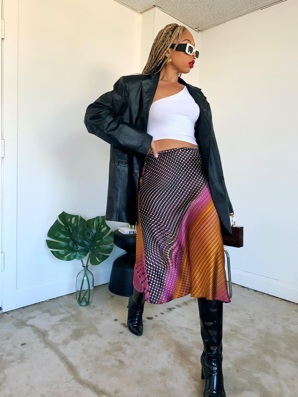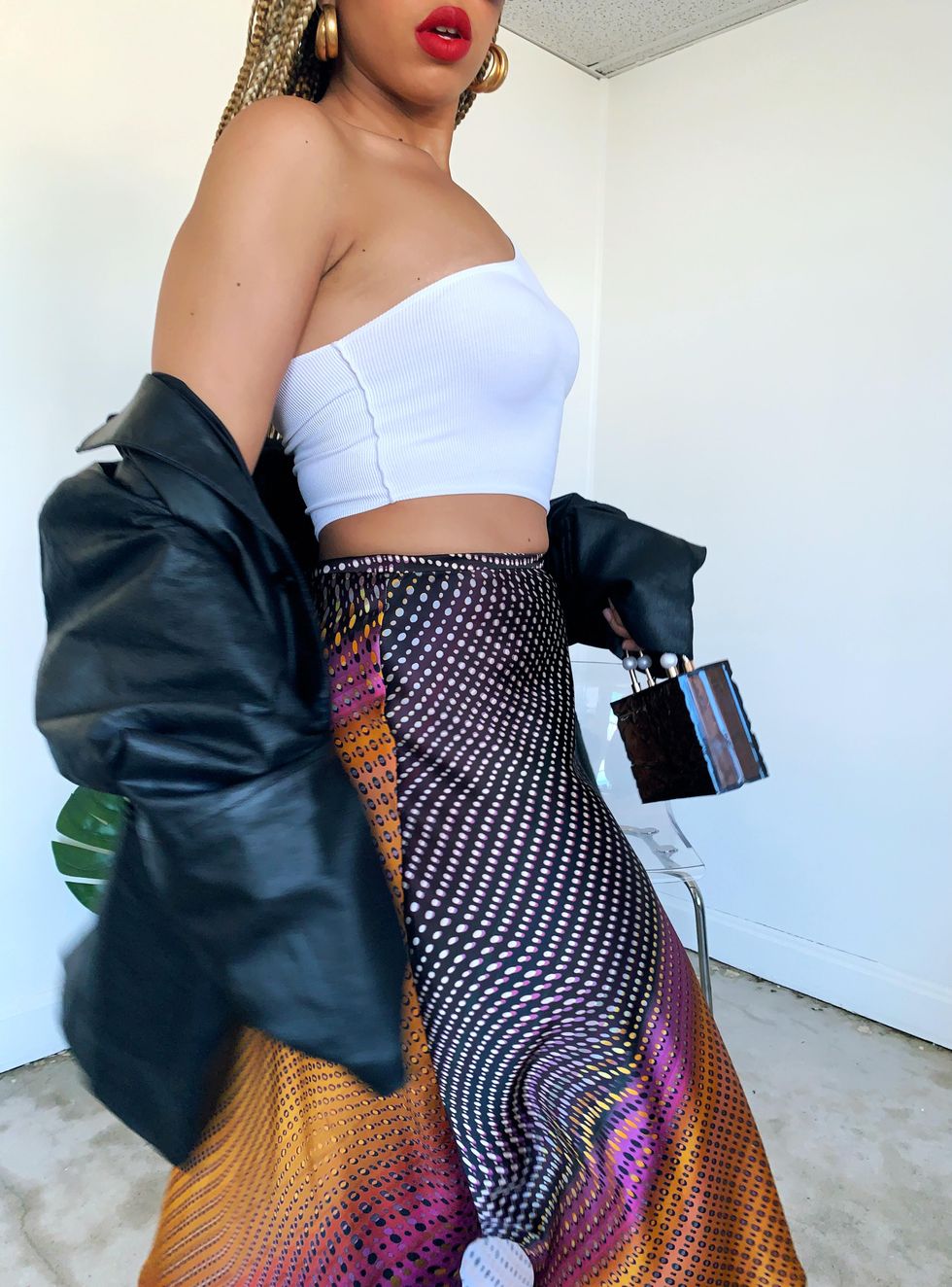 As one who doesn't wear many skirts in my day-to-day looks, I absolutely couldn’t pass on this multi-colored geometric print midi. With its 3D pattern giving its best impression of an optical illusion while gracefully forming every curve, I was immediately impressed with the contrasting hues when initially laying eyes on this piece.