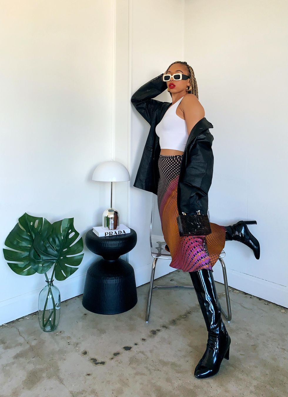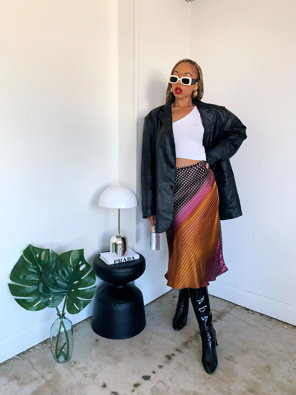 Going for a casual approach, I decided to wear an asymmetrical one-shoulder ribbed knit along with an oversized blazer and patent leather boots. Perfect for a winter weekend look, this skirt is extremely versatile with the ability to transition from season to season.