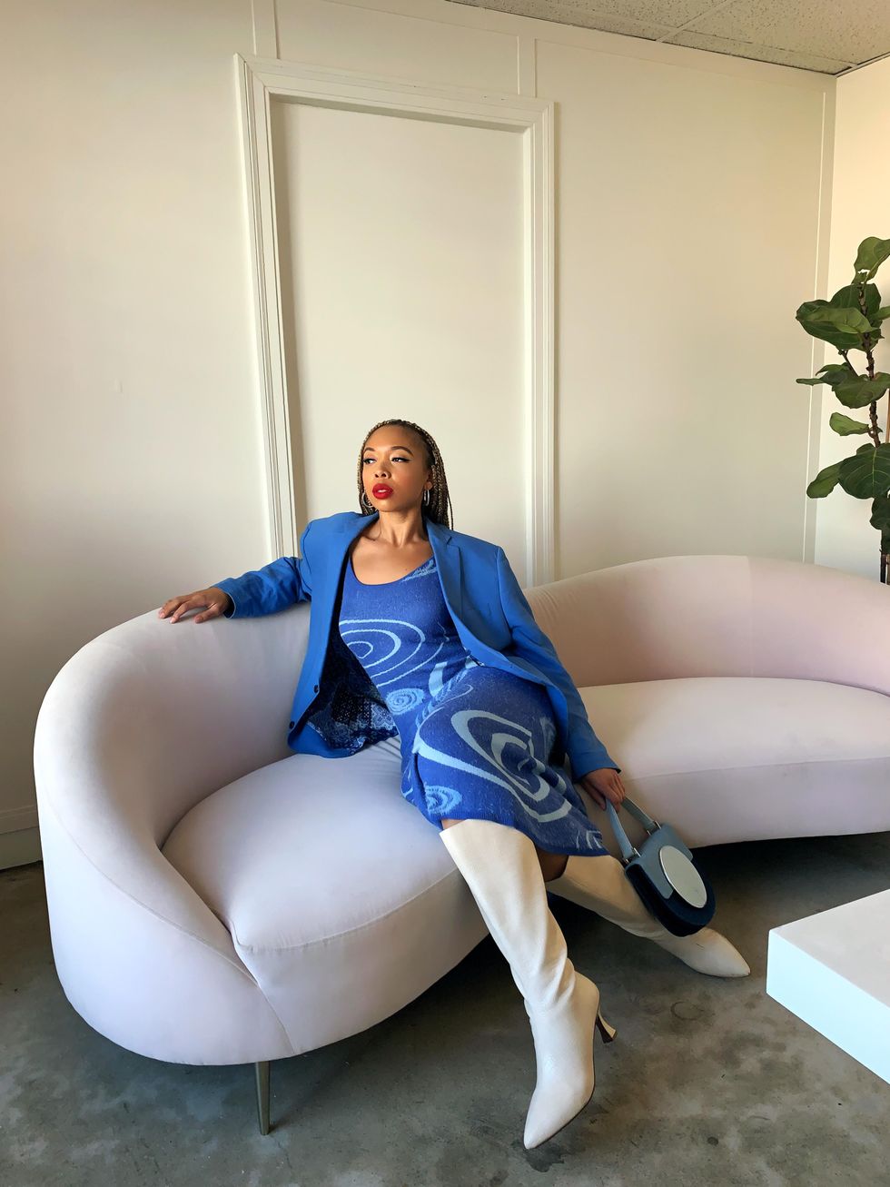 These days when it comes to prints, I love plenty of drama. This knitted swirl patterned slip dress is the perfect day-to-night look when paired with a white boot and matching blue blazer. Not to be too conservative, the cut-out back gives this design an unexpected pop to this cozy maxi.