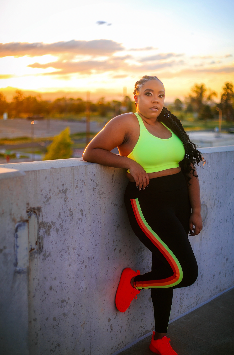 Sometimes you gotta mix it up and create your own set. That's exactly what I did with these two standalone pieces from good ol' Walmart. One thing about Black women, we are gonna create things off the dome. I was doing some random shopping at Walmart and something drew me to these neon-striped leggings. Then, it was almost as if an ultralight beam illuminated this sports bra. And just like that, I created my own set. Neon will always be a part of my wardrobe no matter the season. It was a no-brainer for me to couple my DIY set with equally bold-colored sneakers.