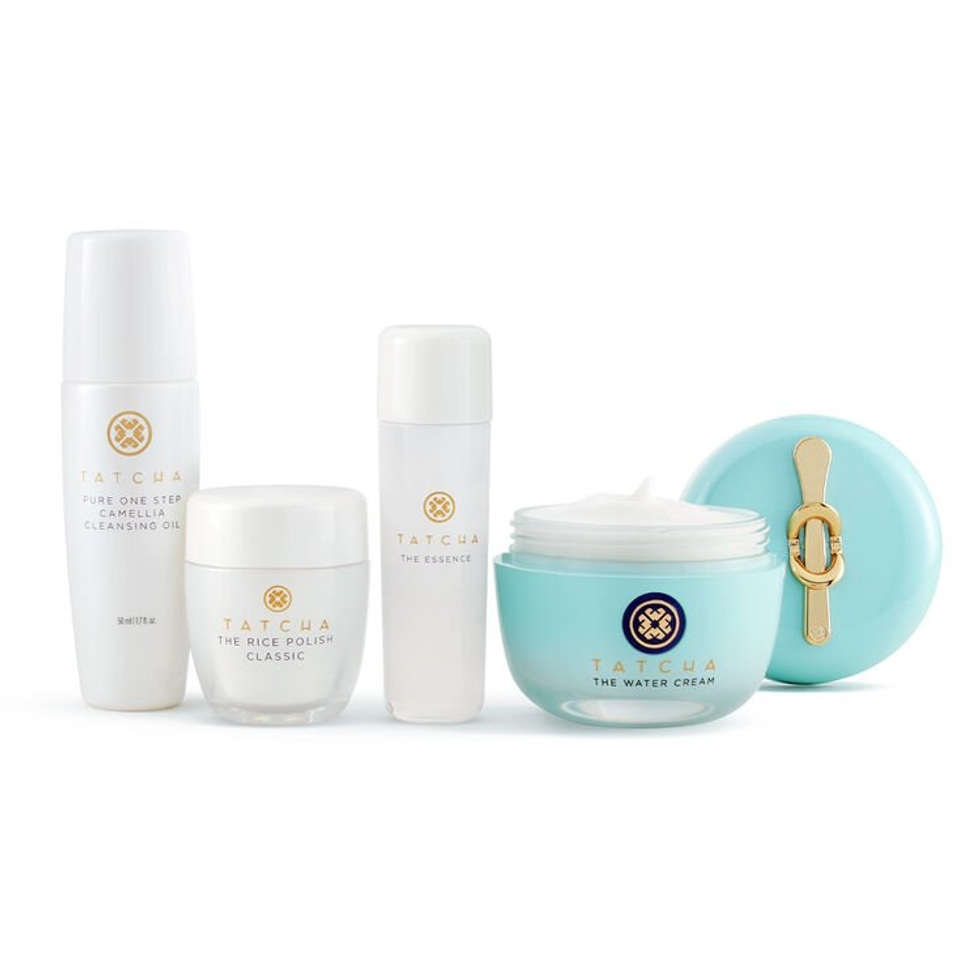 Get all of the essentials in this set from Tatcha which includes its gentle Camellia Cleansing Oil, classic Rice Polish exfoliant, The Essence anti-aging serum, and oil-free hydrating Water Cream.
