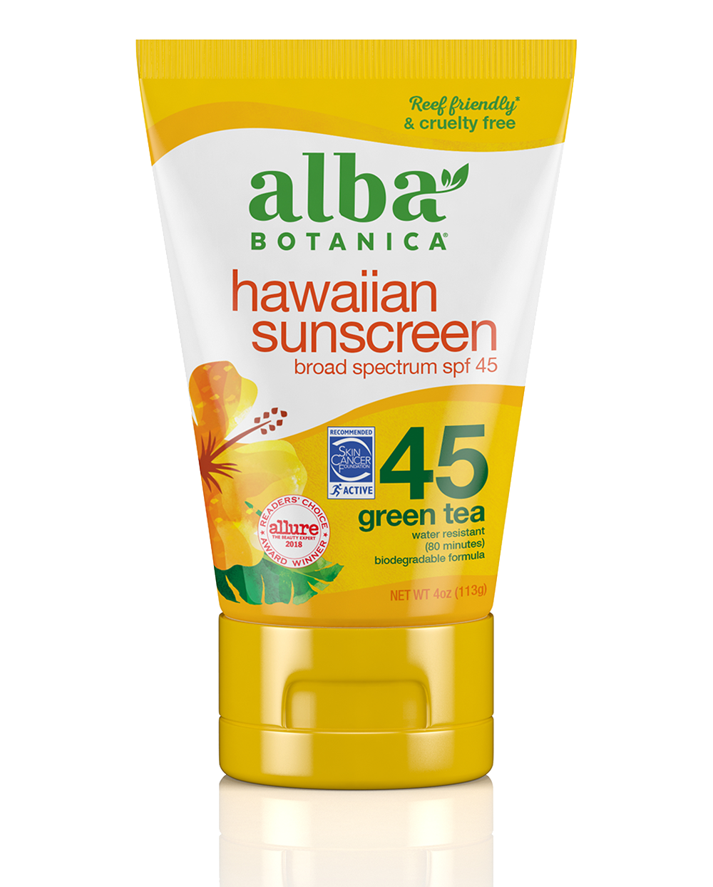 Alba Botanica Hawaiian Green Tea Sunscreen Lotion is a creamy non-greasy moisturizing sunscreen lotion with SPF 45 made of aloe vera, green tea, and tropical fruit extracts. This is a 100 percent vegetarian-friendly product and does not contain oxybenzone, octinoxate, gluten, or synthetic fragrances.