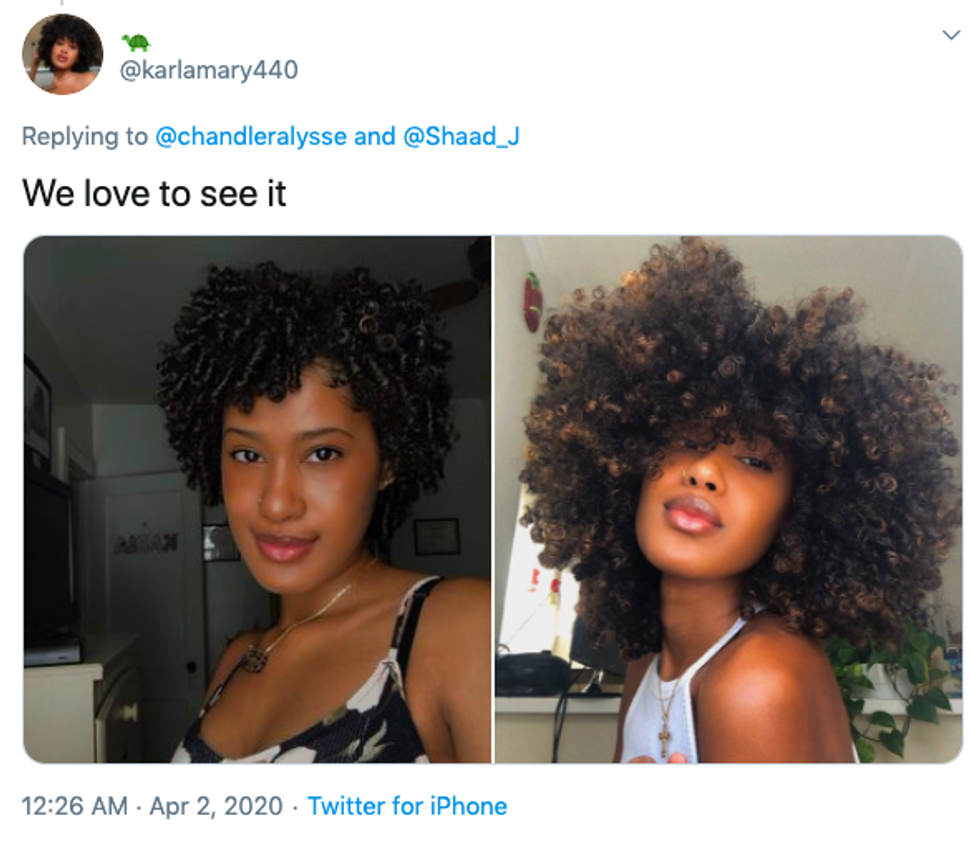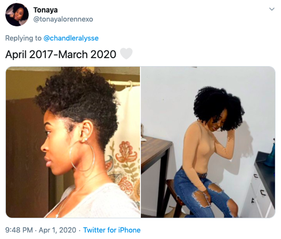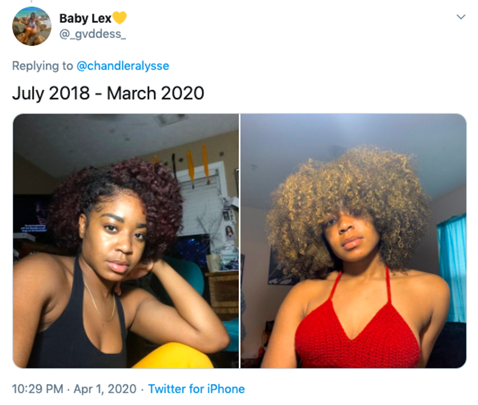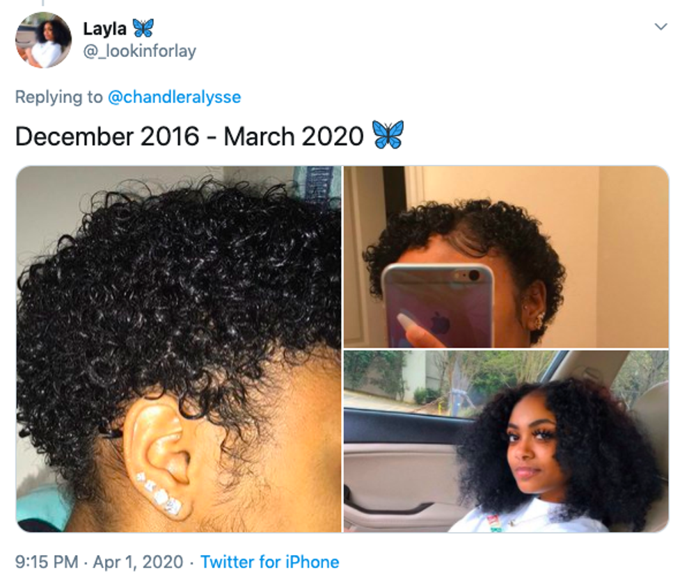 In a thread created by YouTuber, Chandler Alysse, hundreds of women flooded Twitter with the results from their big chop and tips that keep their curls poppin' and it was absolutely everything. Chandler, who experienced hella growth since her big chop, said that implementing apple cider vinegar, rice water, Jamaican black castor oil, and products from Bella Curls have allowed her curls to return with a vengeance.