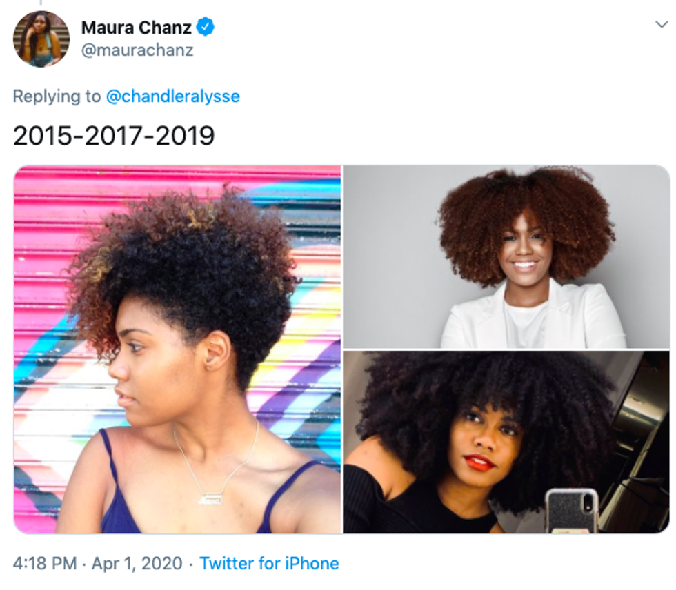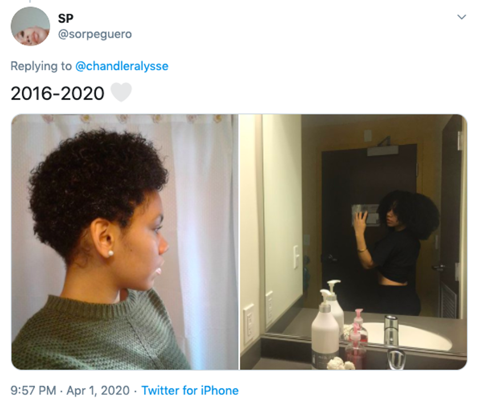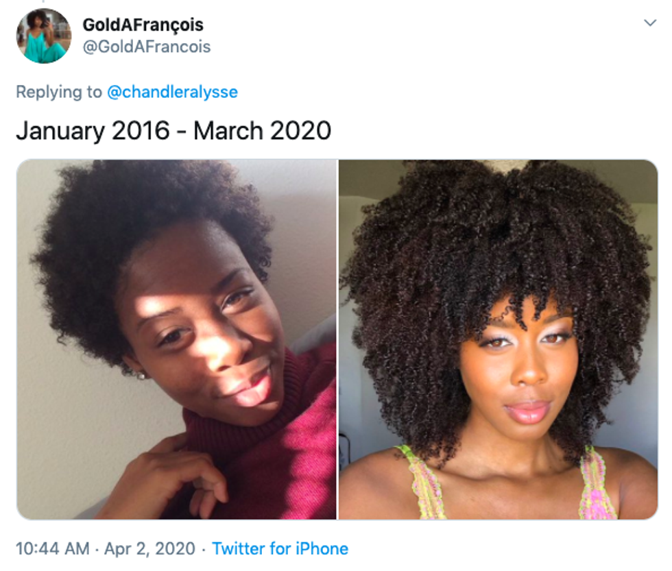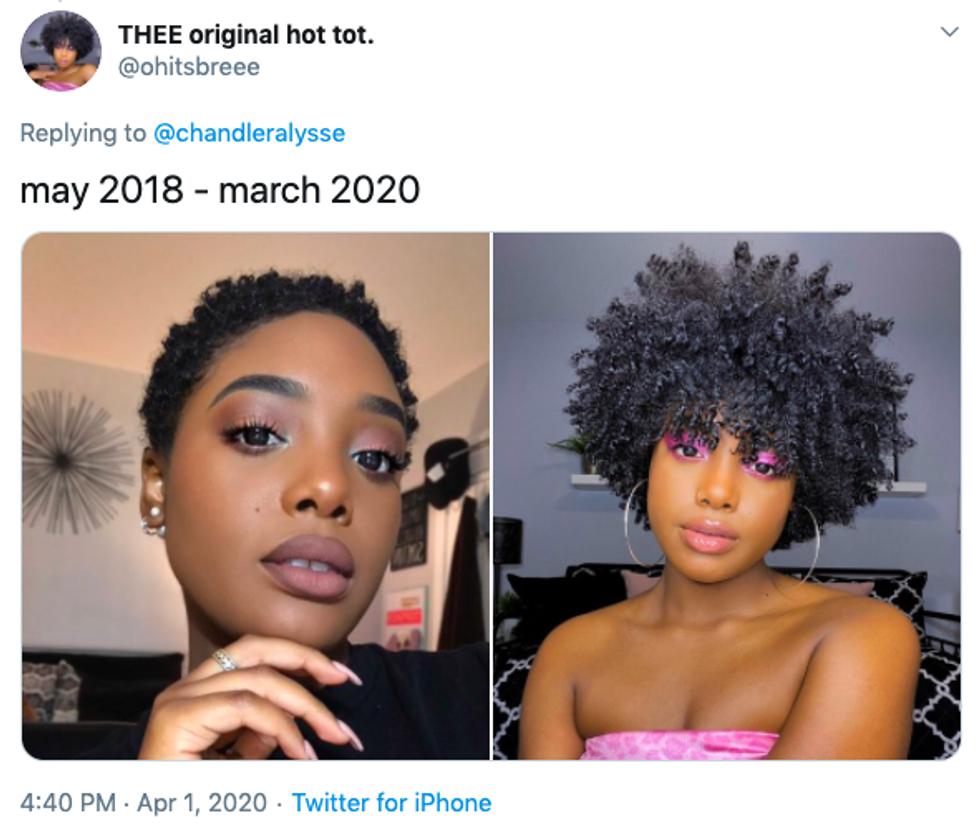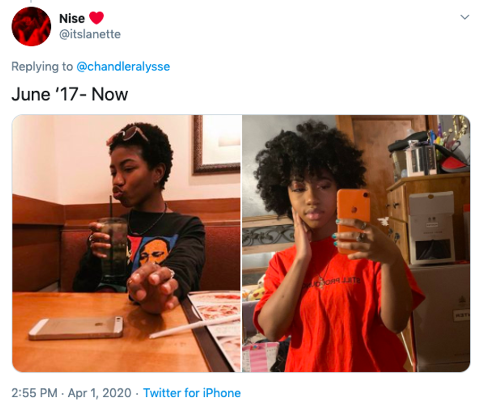 In a thread created by YouTuber, Chandler Alysse, hundreds of women flooded Twitter with the results from their big chop and tips that keep their curls poppin' and it was absolutely everything. Chandler, who experienced hella growth since her big chop, said that implementing apple cider vinegar, rice water, Jamaican black castor oil, and products from Bella Curls have allowed her curls to return with a vengeance.