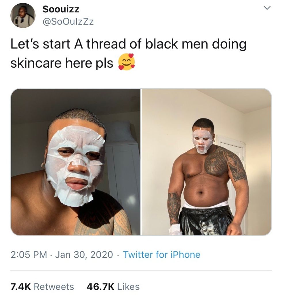 It all started when Twitter user @SoOulzZz said: "Let's start a thread of black men doing skincare here pls."