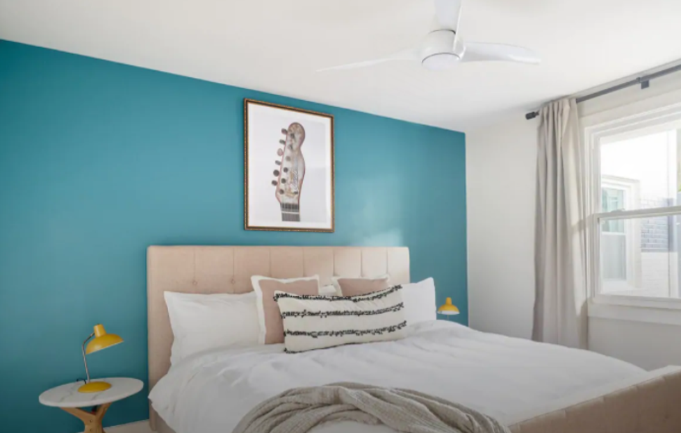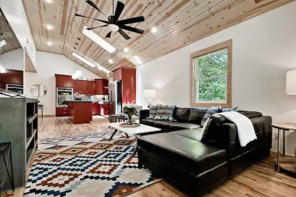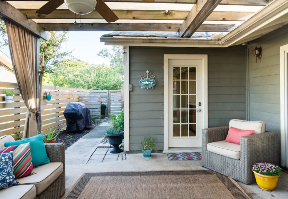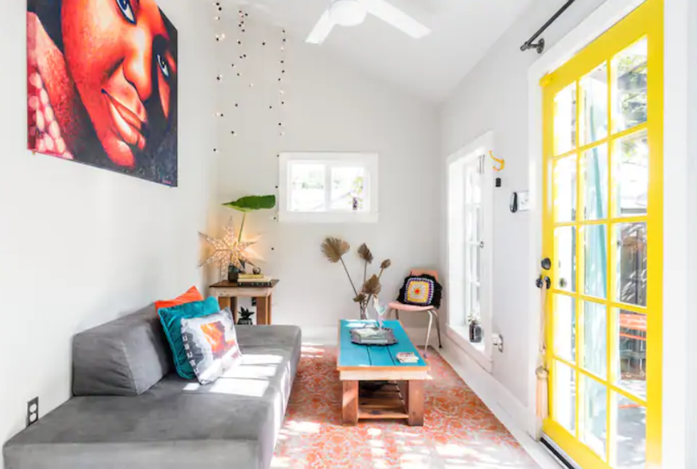 This is a colorful, brightly lit spot that comes equipped with ample outdoor garden space for lounging, vibrant artwork in the indoor seating area, and a rainfall showerhead in the full bathroom. It's also touted as a short drive to local must-see places and has a "homey" feel.