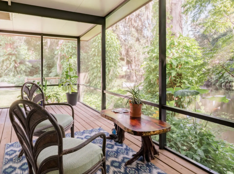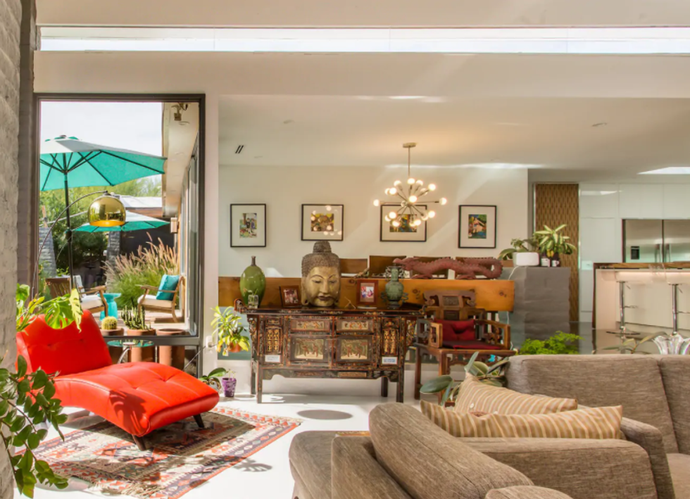 This is a colorful, brightly lit spot that comes equipped with ample outdoor garden space for lounging, vibrant artwork in the indoor seating area, and a rainfall showerhead in the full bathroom. It's also touted as a short drive to local must-see places and has a "homey" feel.