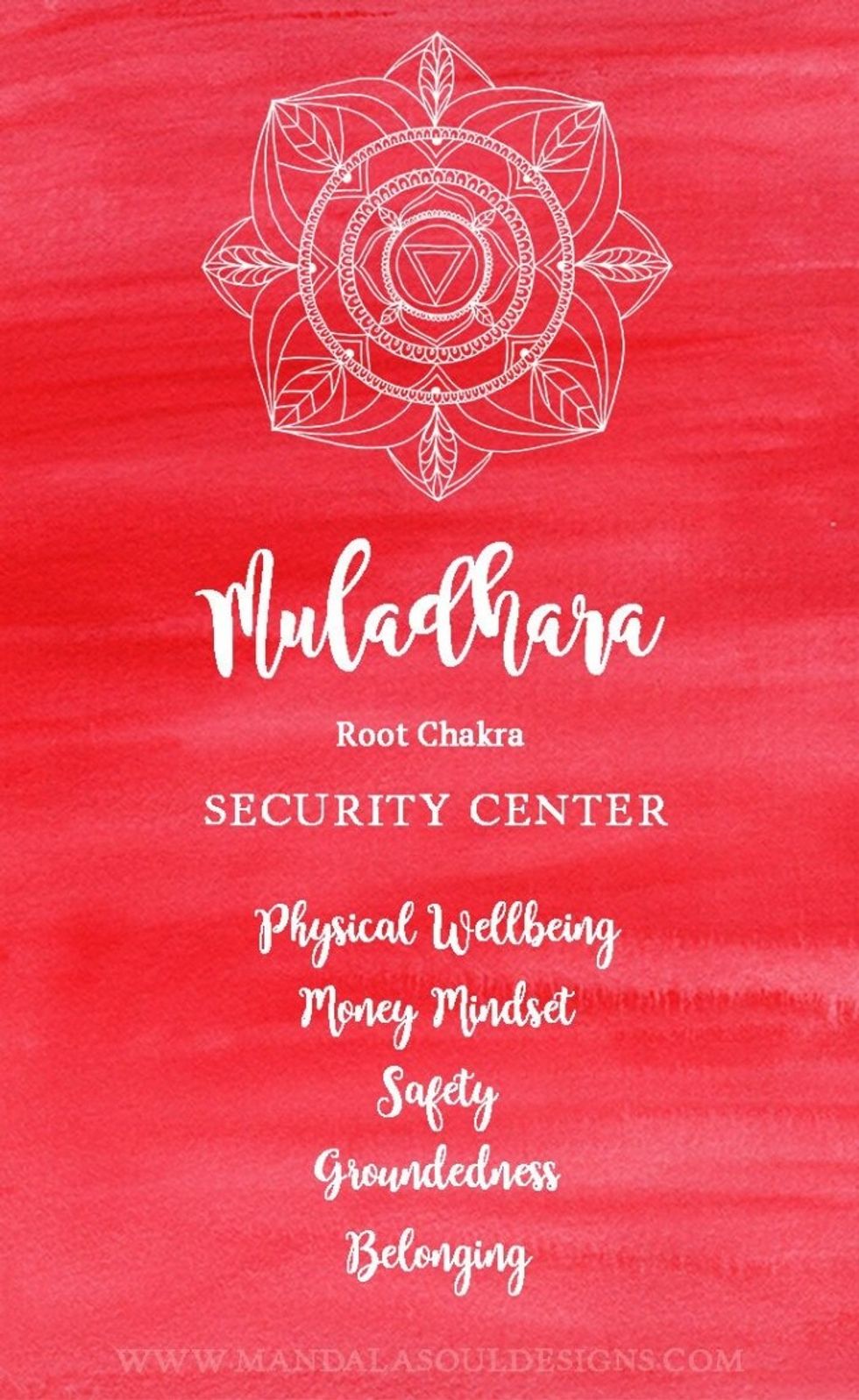 The root chakra, also known as Muladhara, is located at the base of the spine and is one of the most important energy centers due to it being the foundation of your chakra system. It is physically correlated with the legs, feet, colon, and the adrenal glands. This particular chakra is associated with our sense of security and stability within the world. It represents your basic needs for survival (food, water, shelter) and it represents your physical body and experience. Think of it as your more primal nature.