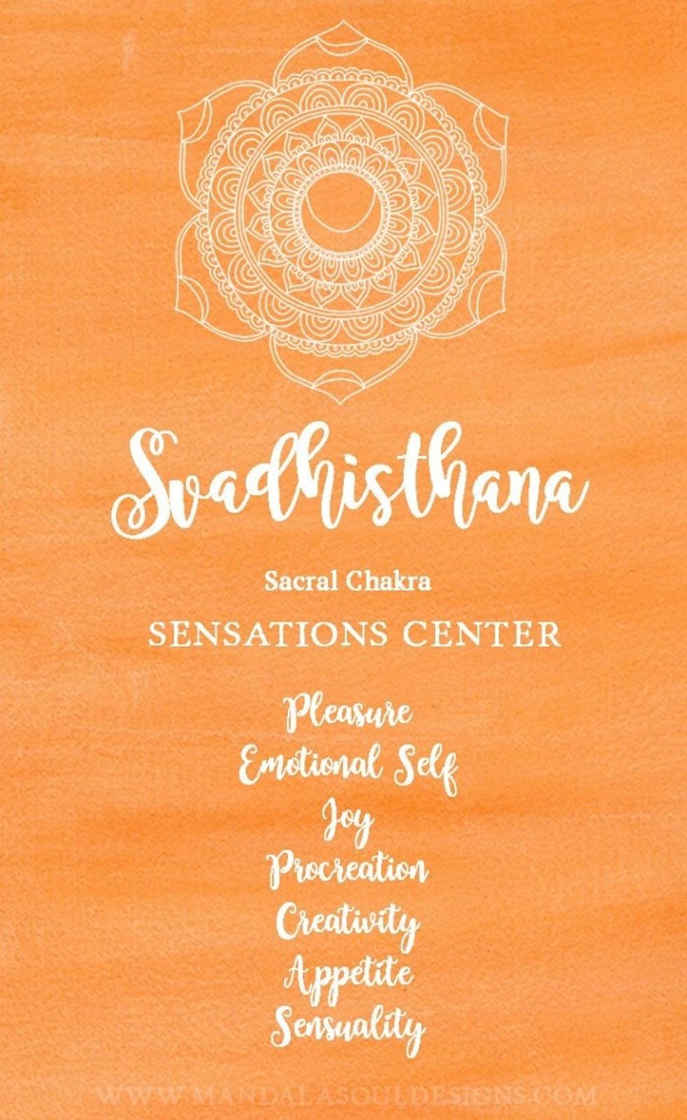 The sacral chakra, also known as Svadhishthana, is located a few inches below the navel and is associated with the emotions, creativity, and sensuality. Physiologically, this chakra is associated with the reproductive system. It represents the element of water and is known as a more feminine energy center. The way that we relate to others is dictated by how balanced the sacral chakra. Symptoms of an imbalanced sacral chakra include codependent relationships with people or substances, being overly emotional or completely numb to your feelings, overindulging in sexual fantasy, and even lacking a sex drive altogether.