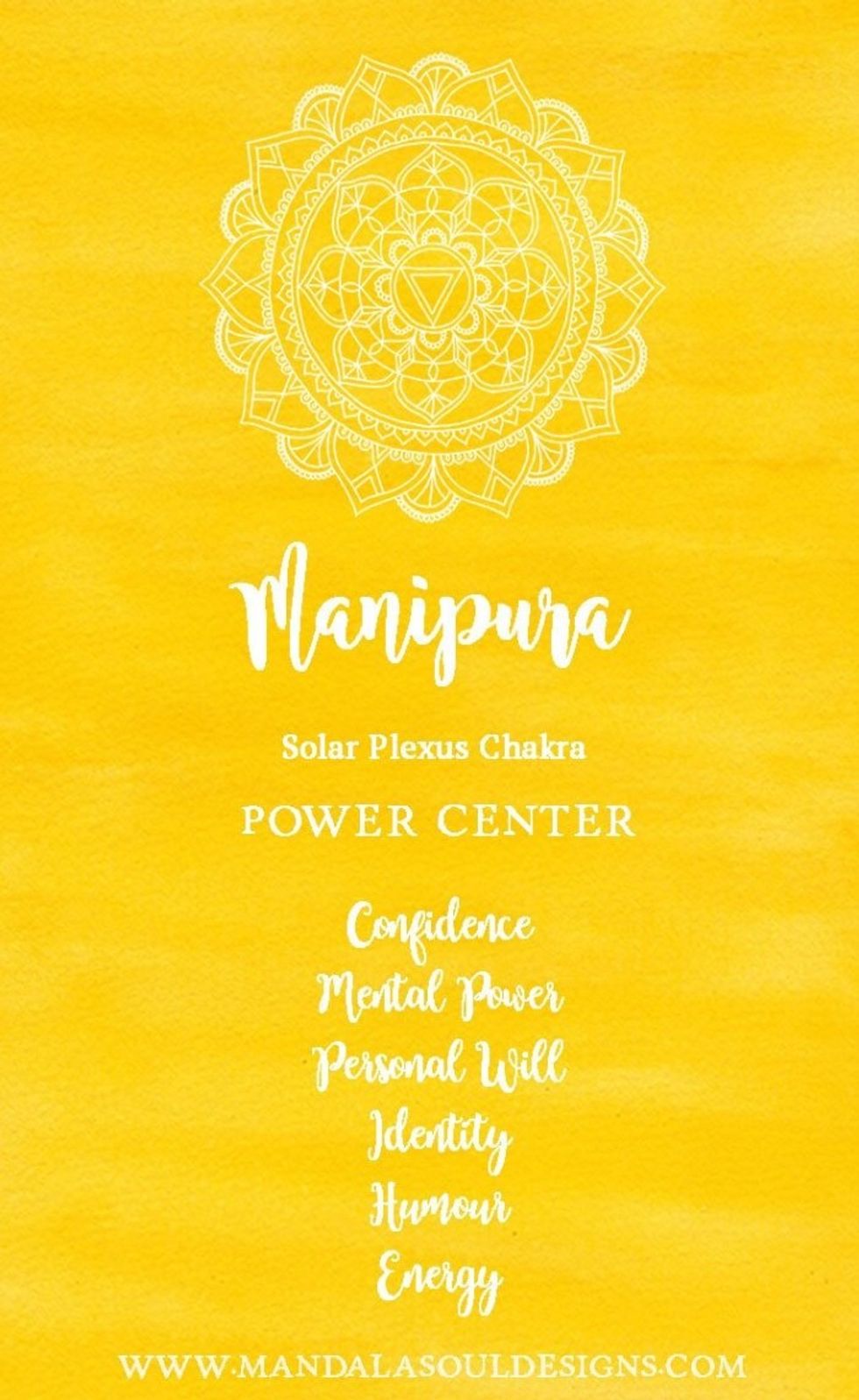 The solar plexus chakra, also known as Manipura, is located in the upper part of your stomach where your diaphragm rests. This chakra is associated with digestive system and metabolism. Its element is fire and it is often associated with the Sun. The Solar Plexus governs your will power, confidence, and independence. Imbalances in this chakra can result in a misuse of your personal power through manipulative or abusive tactics (on the opposite end of the spectrum, this can manifest as a sense of helplessness and irresponsibility), a lack of clear direction and purpose in your life, and making a shit ton of plans that you can't seem to practically follow through on.