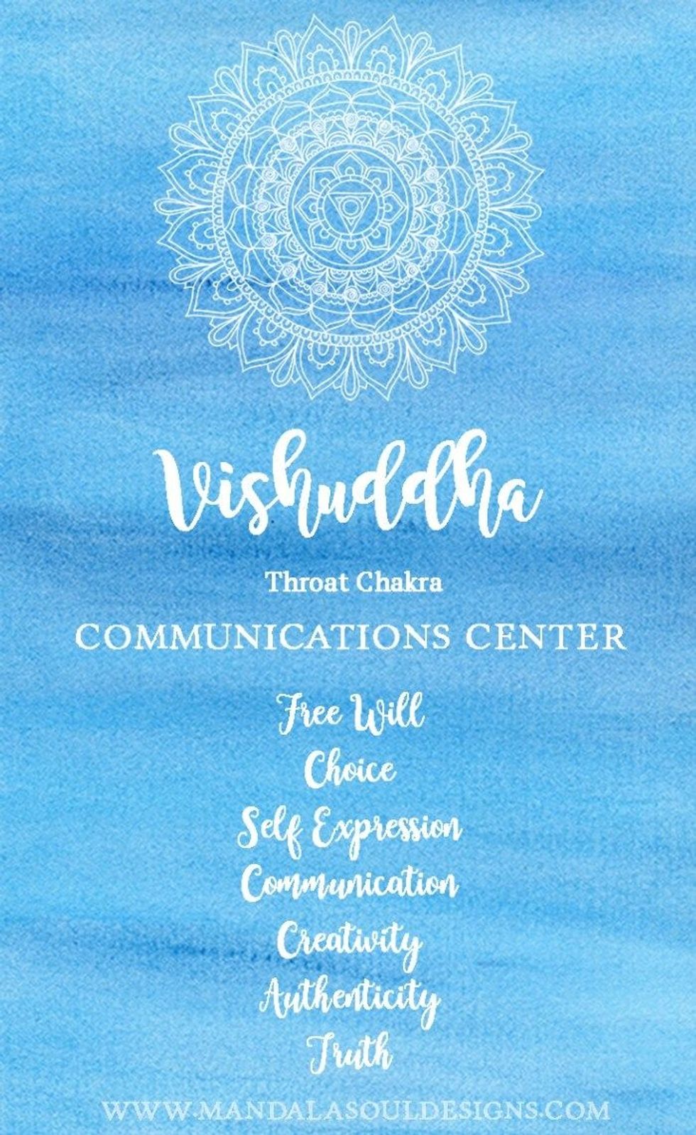 The throat chakra, also known as Vishuddha, is located at the base of the throat. It is related to the element of sound, driving our communication and personal expression. This particular chakra is associated with the mouth, jaw, and thyroid and it's also linked to the shoulders and neck. Characteristics of the throat chakra include the propensity to express your truth, your ability to bring forth creative ideas to reality, and realizing your purpose in life. Both the throat and sacral chakras are naturally connected as the sacral houses the emotions and creativity, while the throat chakra actually gets it out there.