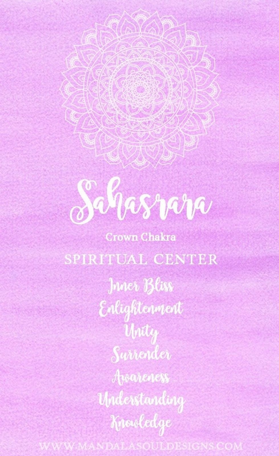 The crown chakra, also known as Sahasrara, is located at the top of your head. It governs your connection to higher states of consciousness radiating outwards into the ethers to receive insight from God/Spirit/the Universe. This chakra is associated with the hypothalamus and pituitary glands which regulate the endocrine system. Due to its placement, the crown chakra is associated with the brain and nervous system as well.