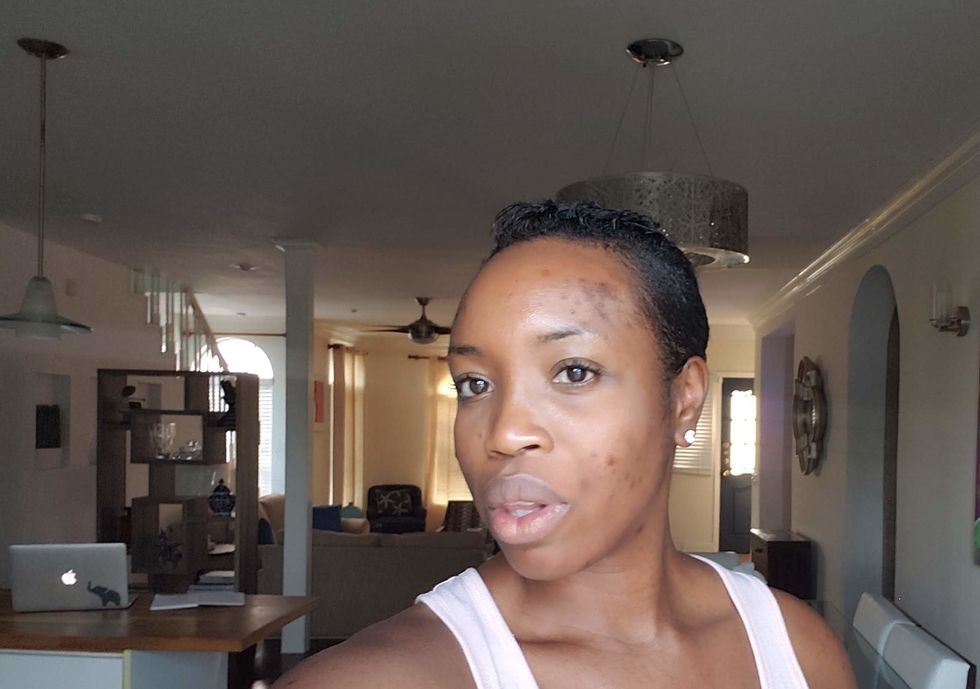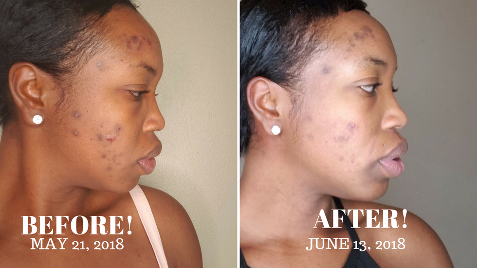 Pimples of epic proportions popped up on my cheeks and on both sides of my forehead, just above the brows. When one blemish disappeared, another appeared almost instantly in its place. The bumps were painful, swollen, and tore my skin leaving massive breakage and tears. "Healing" actually turned to hyperpigmentation and I found myself wearing makeup everywhere, even in the gym (only to watch it drip onto the floor mat as I did my fifth set of squats).