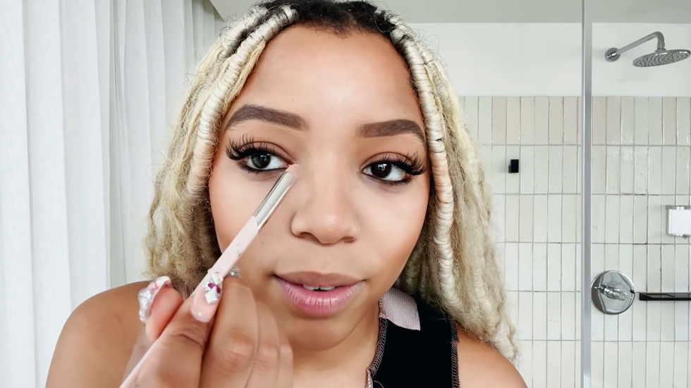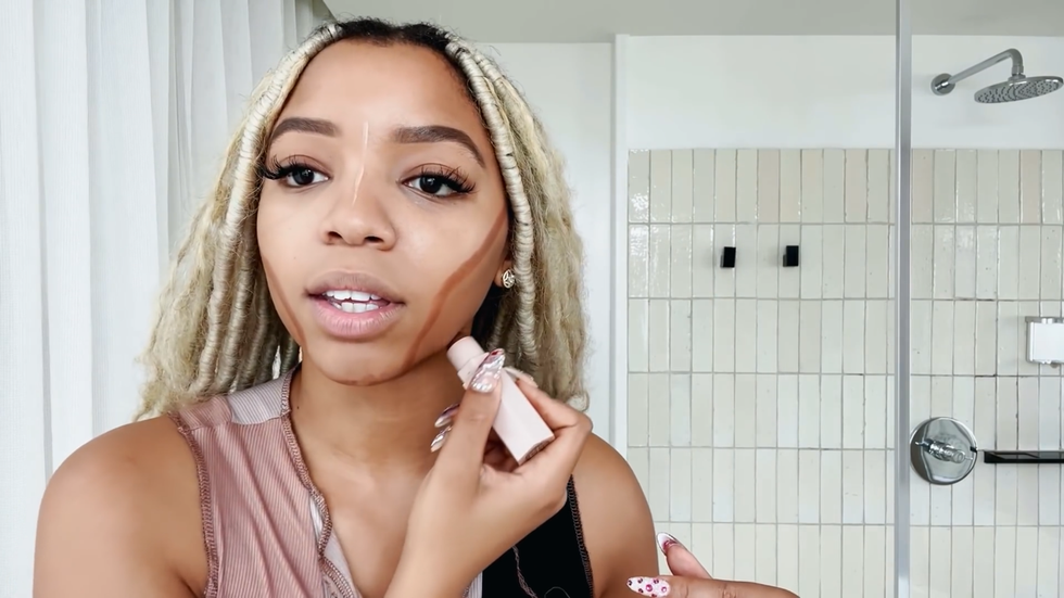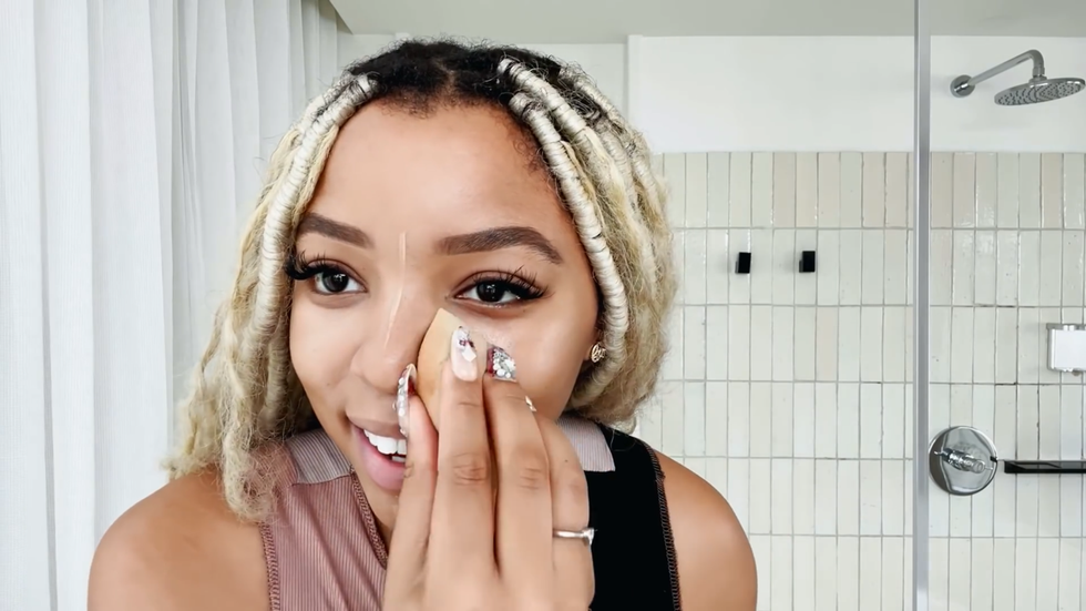Next, the "Have Mercy" singer gets real friendly with the concealer. She uses it under her eyes, above her lip, and the bridge of her nose with the help of her Beauty Blender and a spritz of rosewater to blend it out.