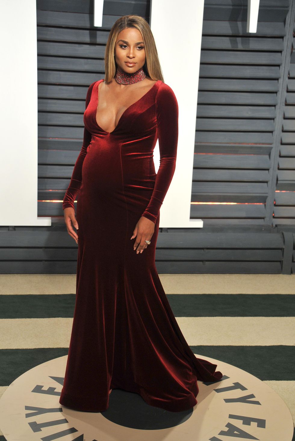 Picture Ciara strutting down the not-so-red carpet in this plush velvet, oxblood Jovani Signature gown that perfectly shows off her burgeoning baby bump. She did that. She and her hubby were welcoming their first child together and this was a perfect way to make memories of a beautiful union.