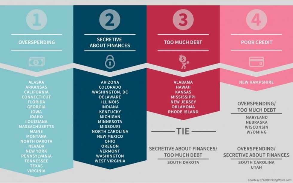 In a new report, GOBankingRates administered a Google Consumer Survey for all 50 states and Washington D.C. where adults were asked to choose their biggest financial deal breaker. Categorized into six divisions–one party doesn't bring into sufficient income, overspending, poor credit, being secretive about finances, one party being too cheap, and having excessive debt. The results?