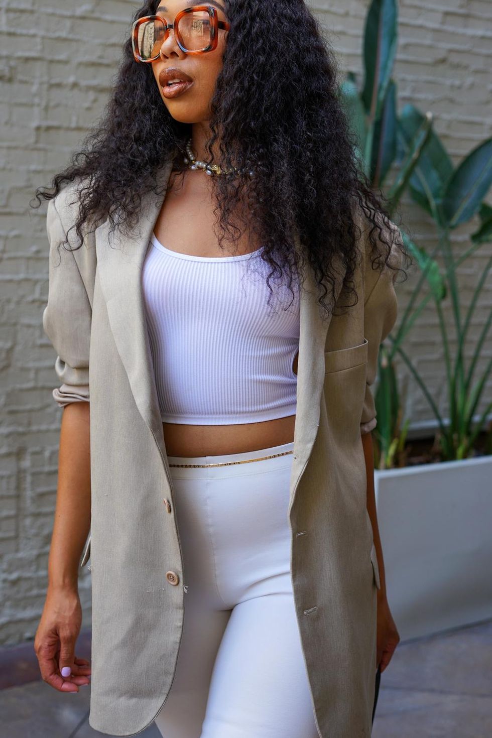 A belly chain was the statement piece in all of our favorite early 2000s music videos. Although this classic has remained popular when worn with swimwear, it's making a steady comeback with casual everyday or more polished looks. I styled it with a biker short and crop top topped with a beige blazer for a new perspective on this major throwback.