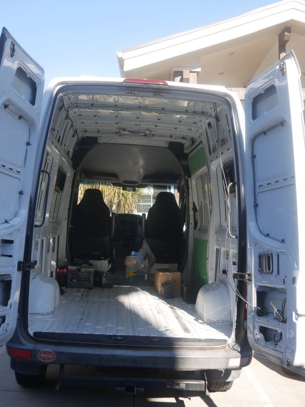"To give you an idea of our van, it's like the Amazon delivery van, so basically it's like a cargo van. It's two seats in the front, and then it's completely empty in the back. I think our van is like 144 inches long so it's definitely a lot smaller than anything that we've ever lived in.