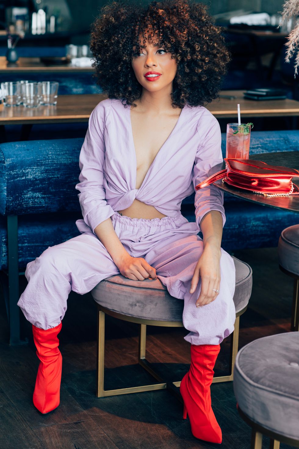 Nothing says effortlessly sexy like a jumpsuit and some booties. For some real fun, use some bold colors like Felicia did in this look! Your jumpsuit game has the potential to level up in a major way if you incorporate accessories and makeup that add a pop of color. According to Felicia, out of all the looks, this one is the easiest to pull off: