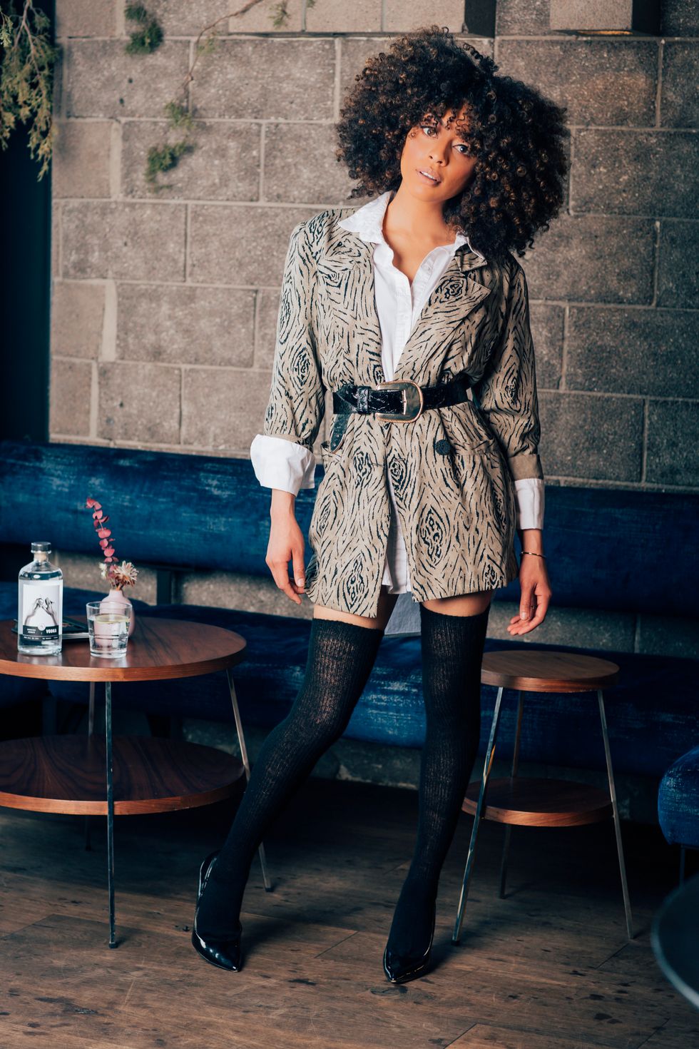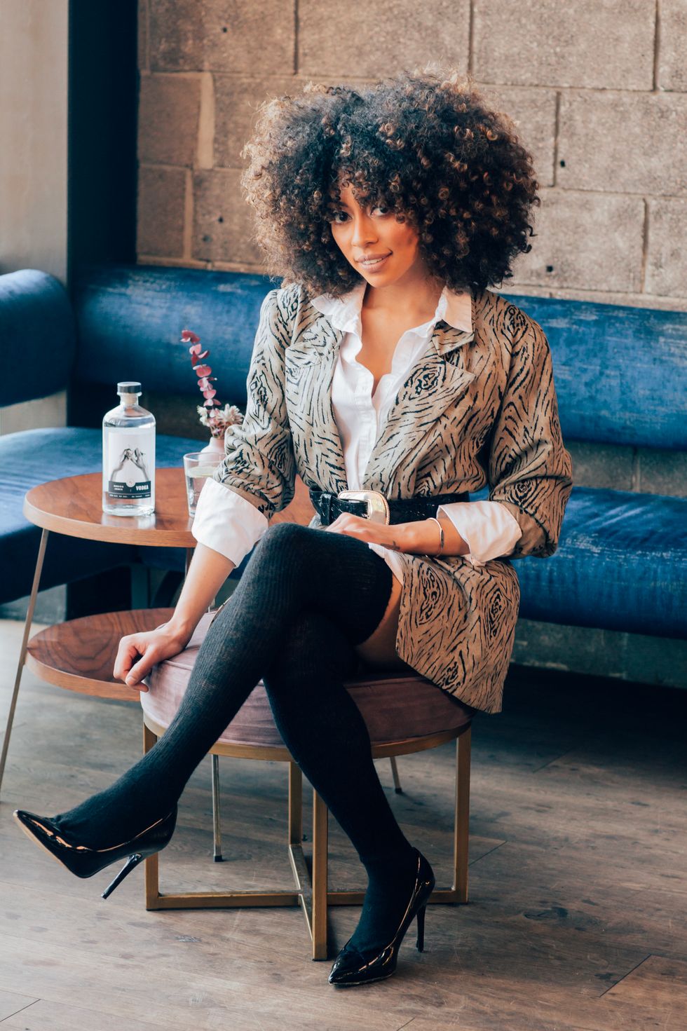 "I don't know about you, but a blazer always makes me feel put together. To keep it sexy for date night, I added thigh high socks and an extended button up shirt. I finished this look with a black pump and a belt to create some structure and emphasize my waist."