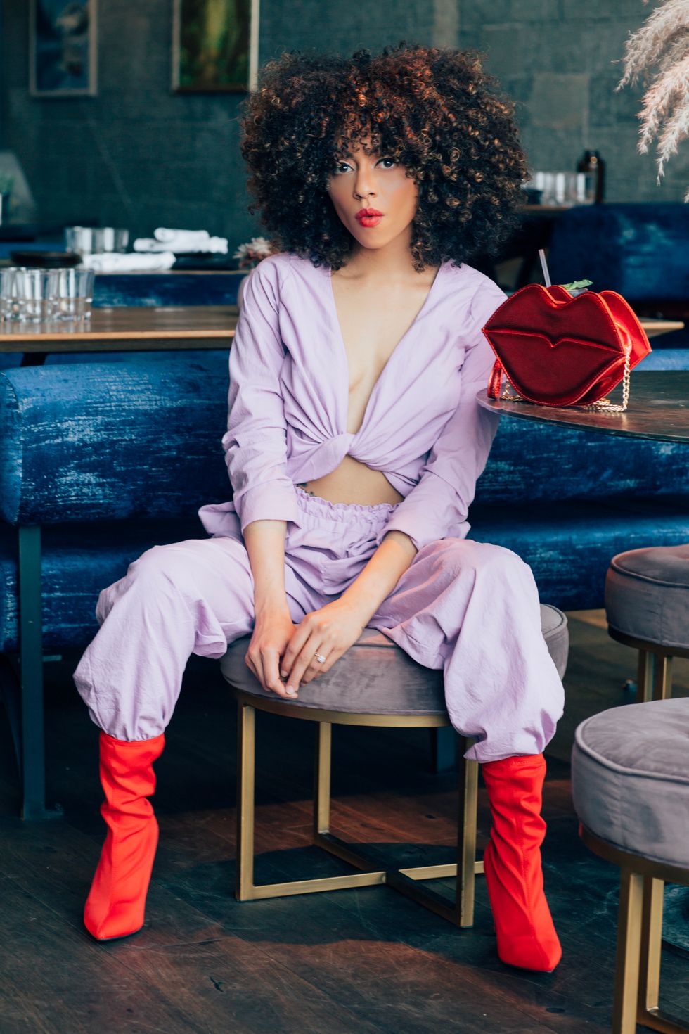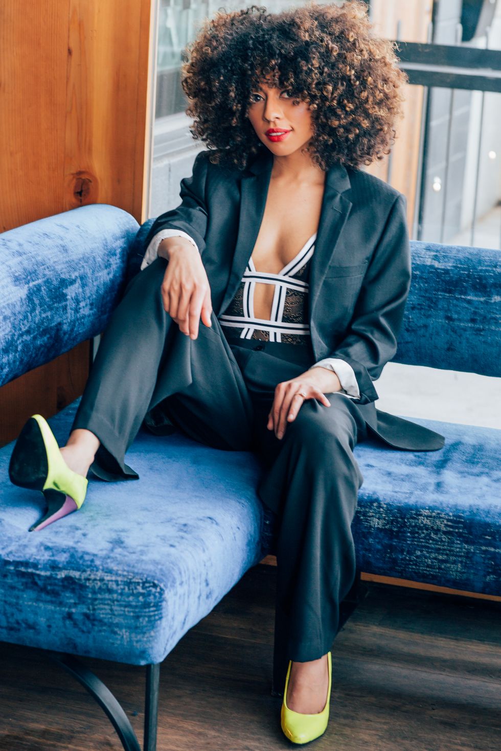 "When the goal is grown and sexy, a pantsuit is definitely my go-to. For the perfect date night look, I added a bodysuit and bright pump. My hair was the only accessory, and yes the bigger the better."