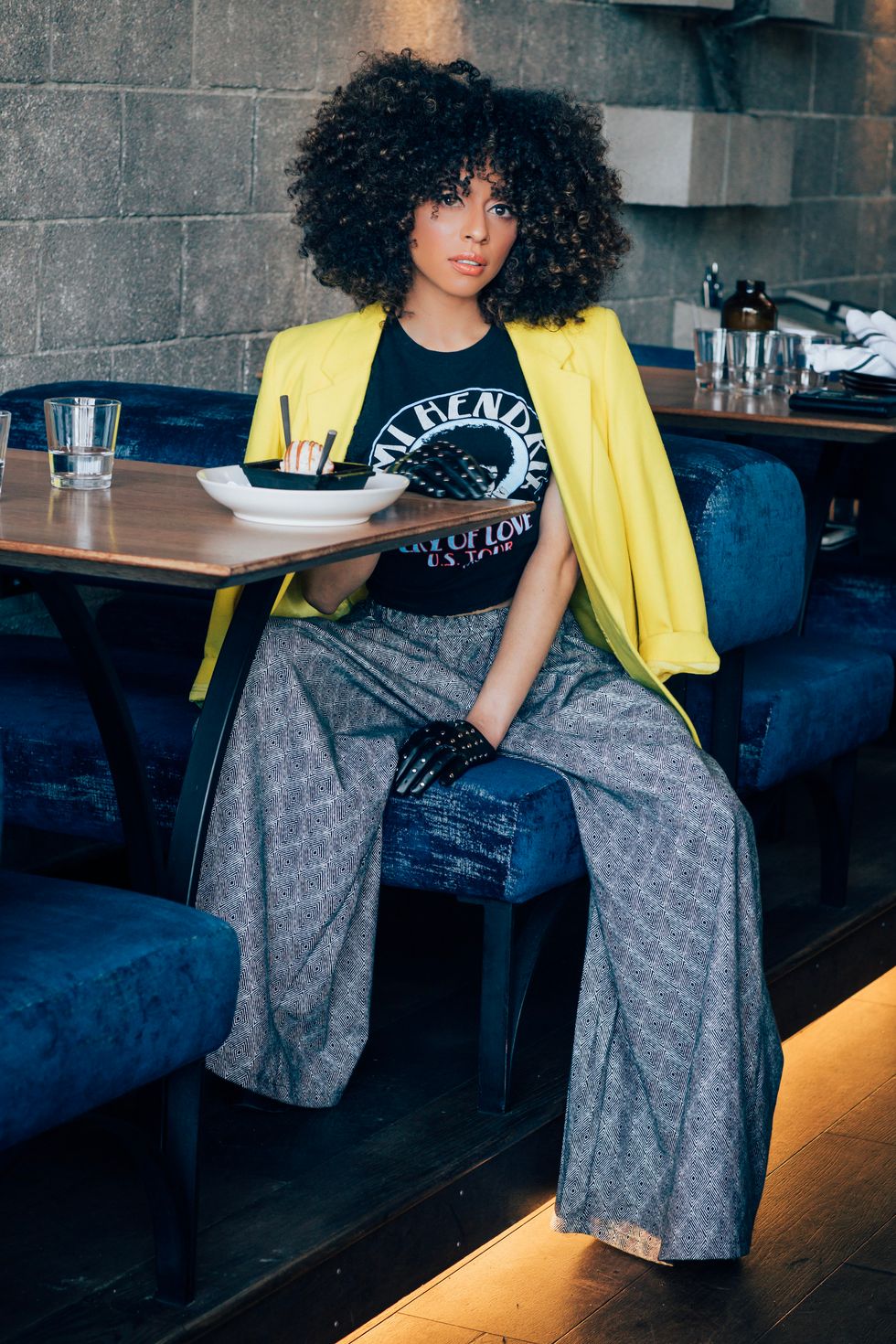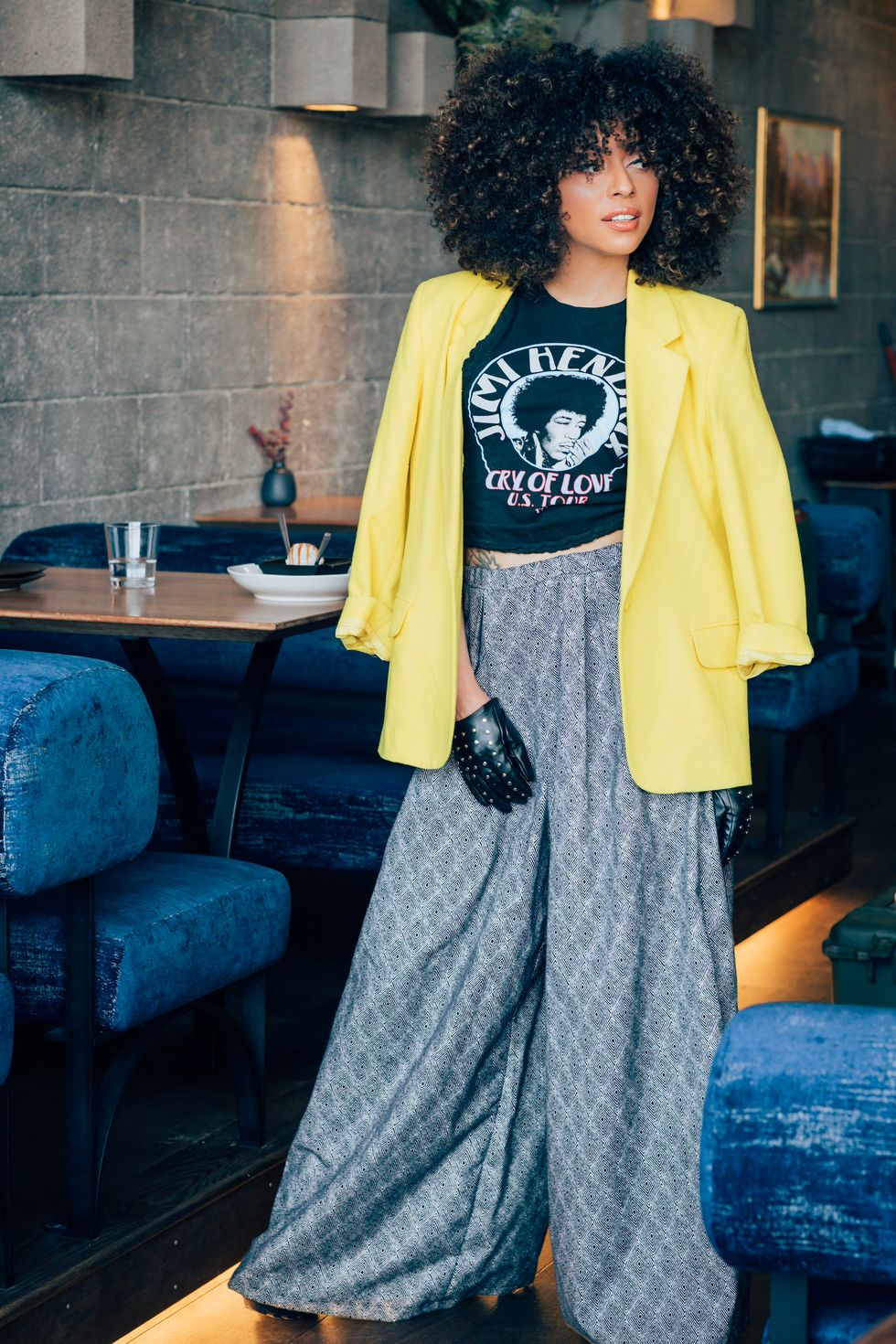 "This chic date night look consist of a pair of my favorite wide leg pants from my clothing line VFM. I paired them with a T-shirt and yellow blazer to add a pop of color. The leather gloves and platform shoe completes the look and adds the perfect amount of edge."