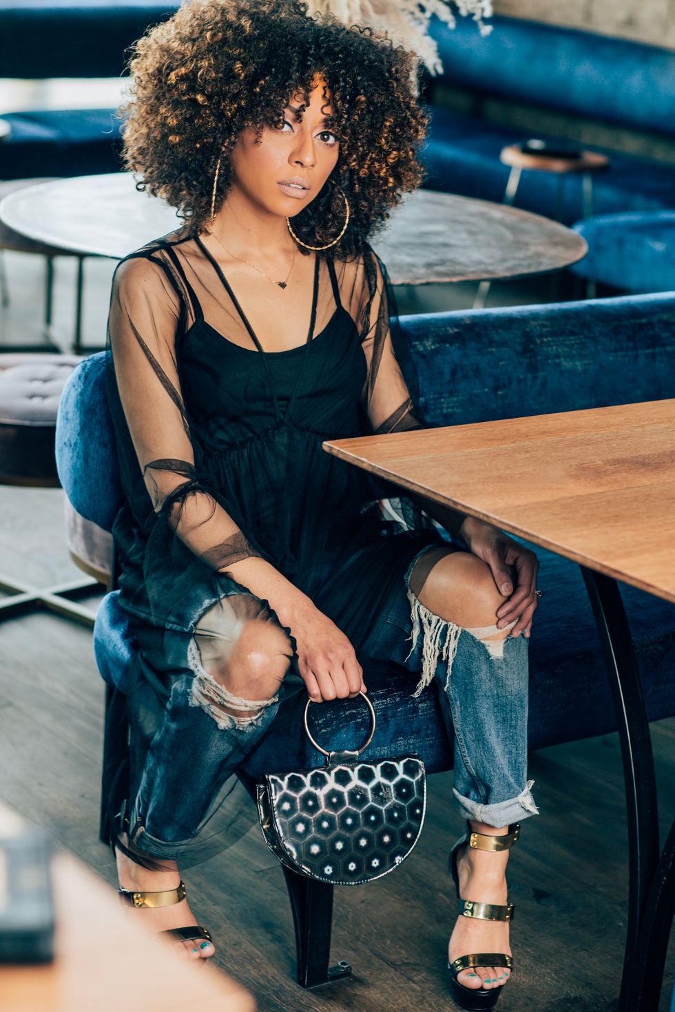 "When all else fails, I feel like you can never go wrong with a little black dress. Creating layers by adding jeans and a sheer overlay automatically takes the look from classic to edgy. The iridescent purse, hoop earrings, and gold shoe adds the perfect final touch to complete my look for date night with bae!"
