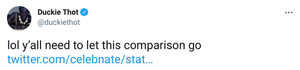 And listen, I'm sure the comparison is meant to be flattering, OK, I get it. I also know that because race relations in America are trash, that most people have no clue how to relate to us other than saying ridiculous shit like somebody as frickin majestic as Duckie 'Damn' Thot can remotely be watered down to such a comparison, but let me be very clear to anyone reading this: absolutely tf not.
