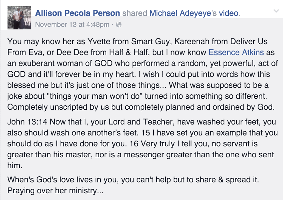 Essence Atkins got down on her knees and washed my friend Allison Pecola Person's feet today which I believe is a wonderful way to exude a simple act of kindness. #WWJD #TYLPosted by Michael Adeyeye on Friday, November 13, 2015