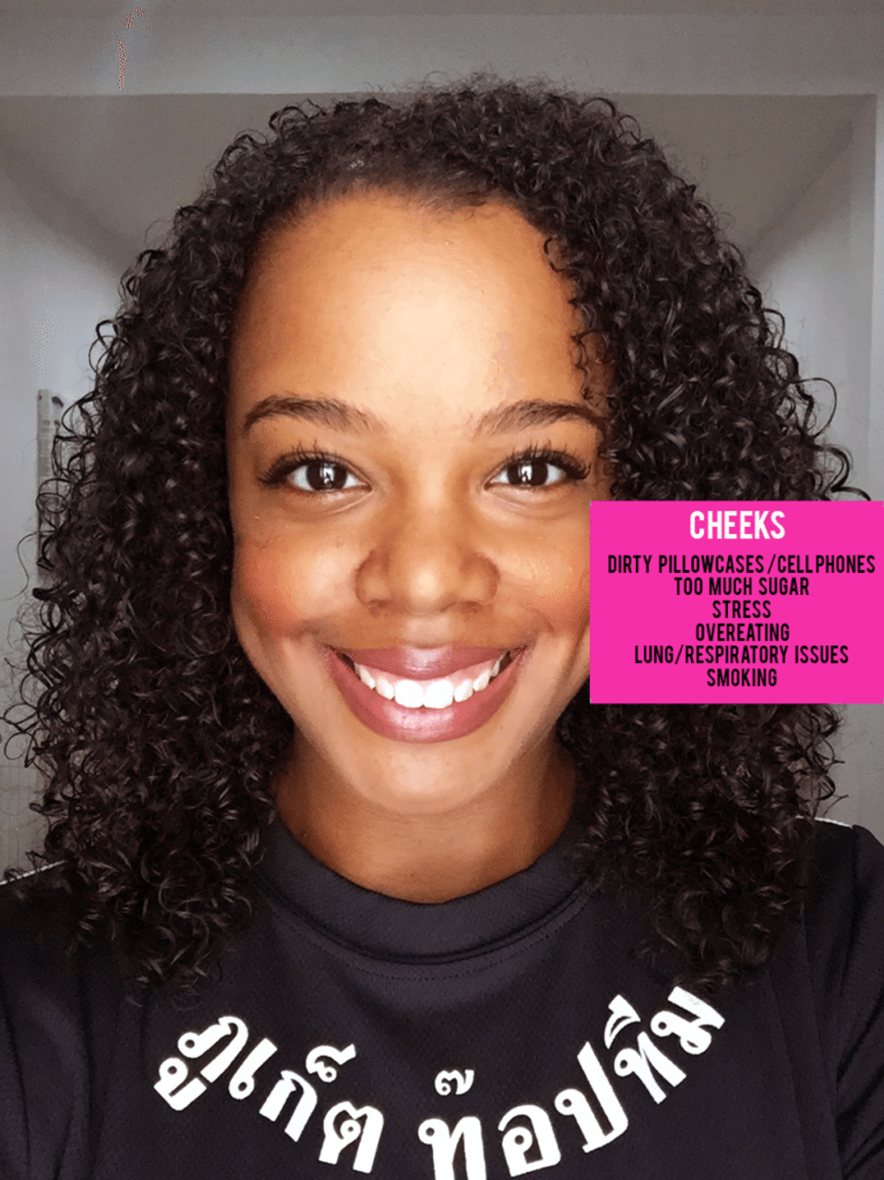 If you break out around your cheeks, it could be something as simple as dirty pillowcases or cell phones, but it could also be too much sugar, stress, overeating, or lung/respiratory issues. If you're a smoker, you might want to watch out as smoking could possibly be the cause of breakouts on the cheek. There's a debate going on between researchers as to whether smoking and whiteheads or acne on the cheeks are linked. Super interesting stuff!